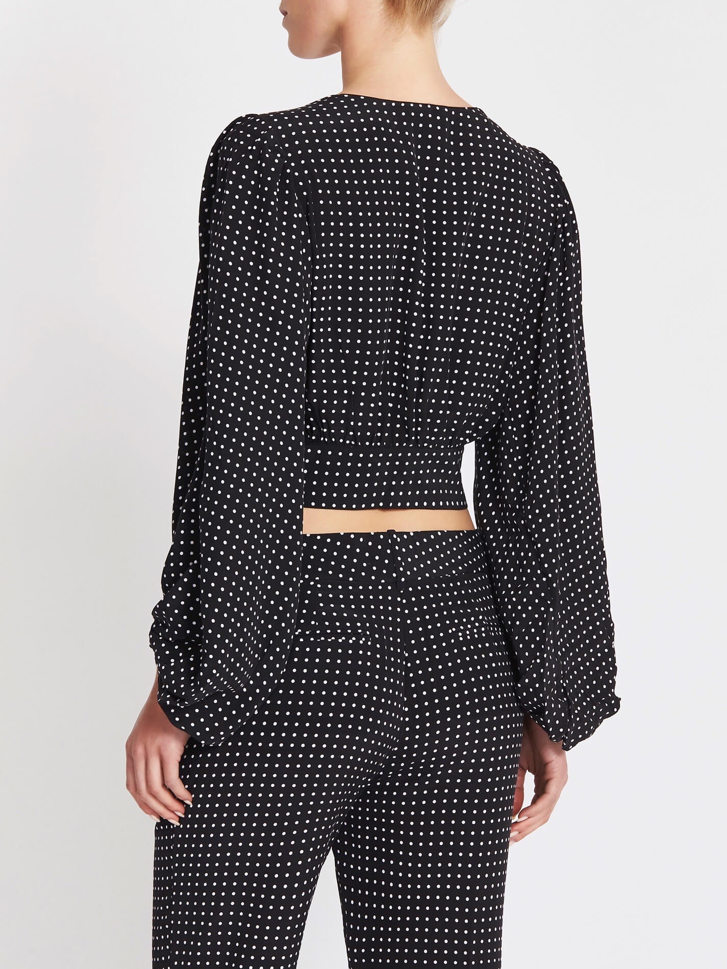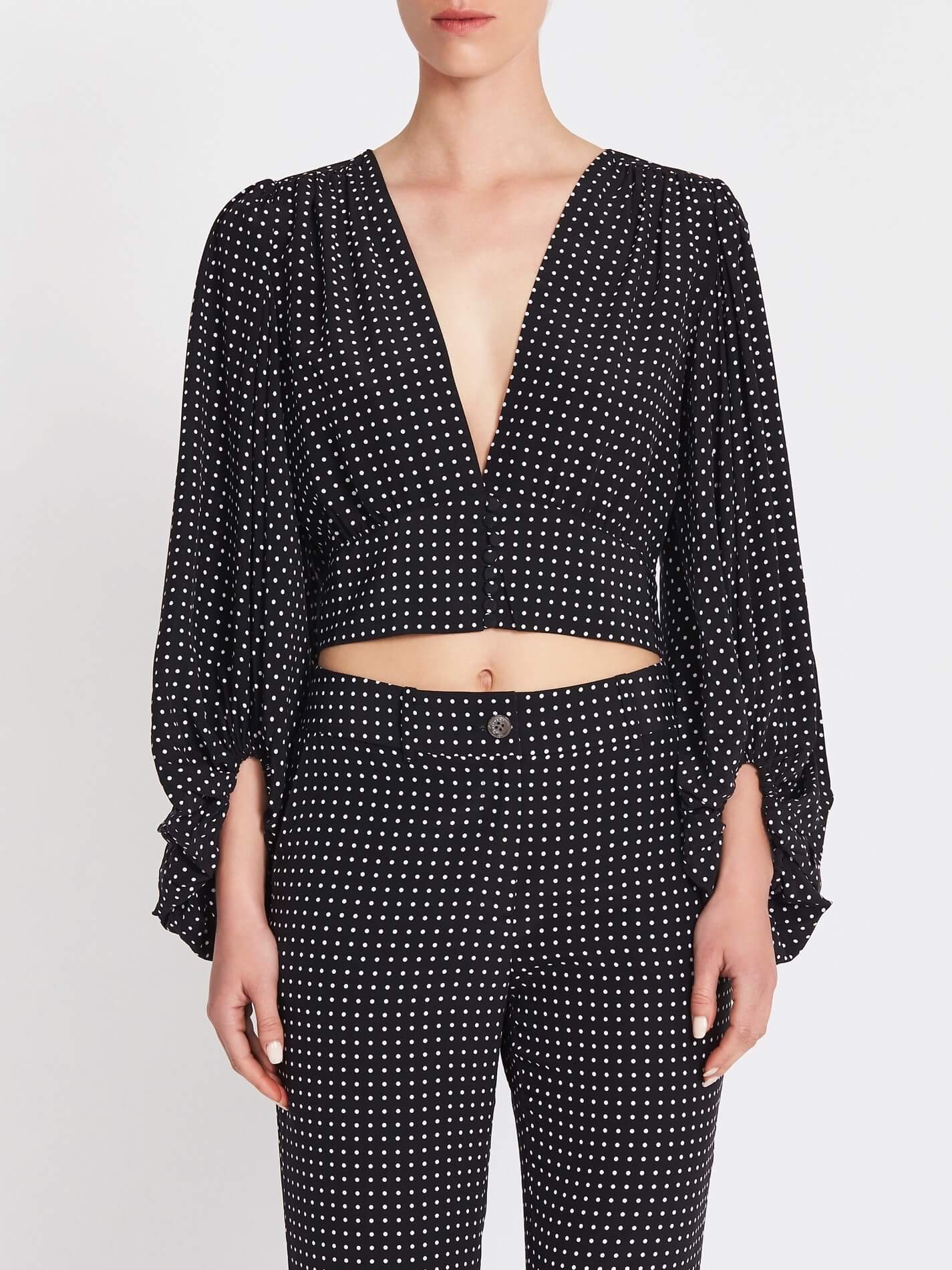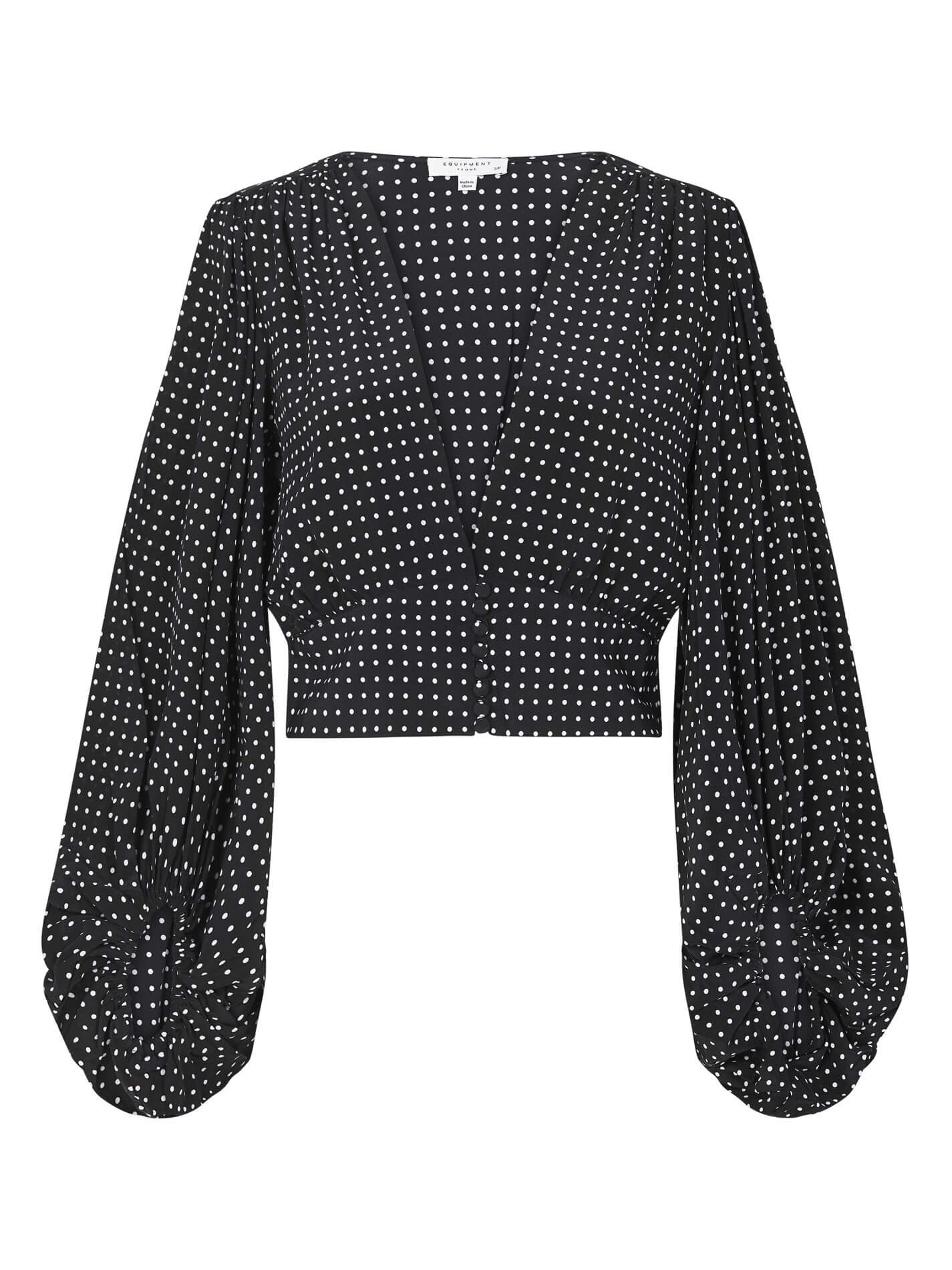 Inspired by vintage bolero jackets, the Sola Jacket in Black and White Polkadot from French brand Equipment features exaggerated sleeve detail. Pair this with the Equipment Lita Trouser to complete the look.