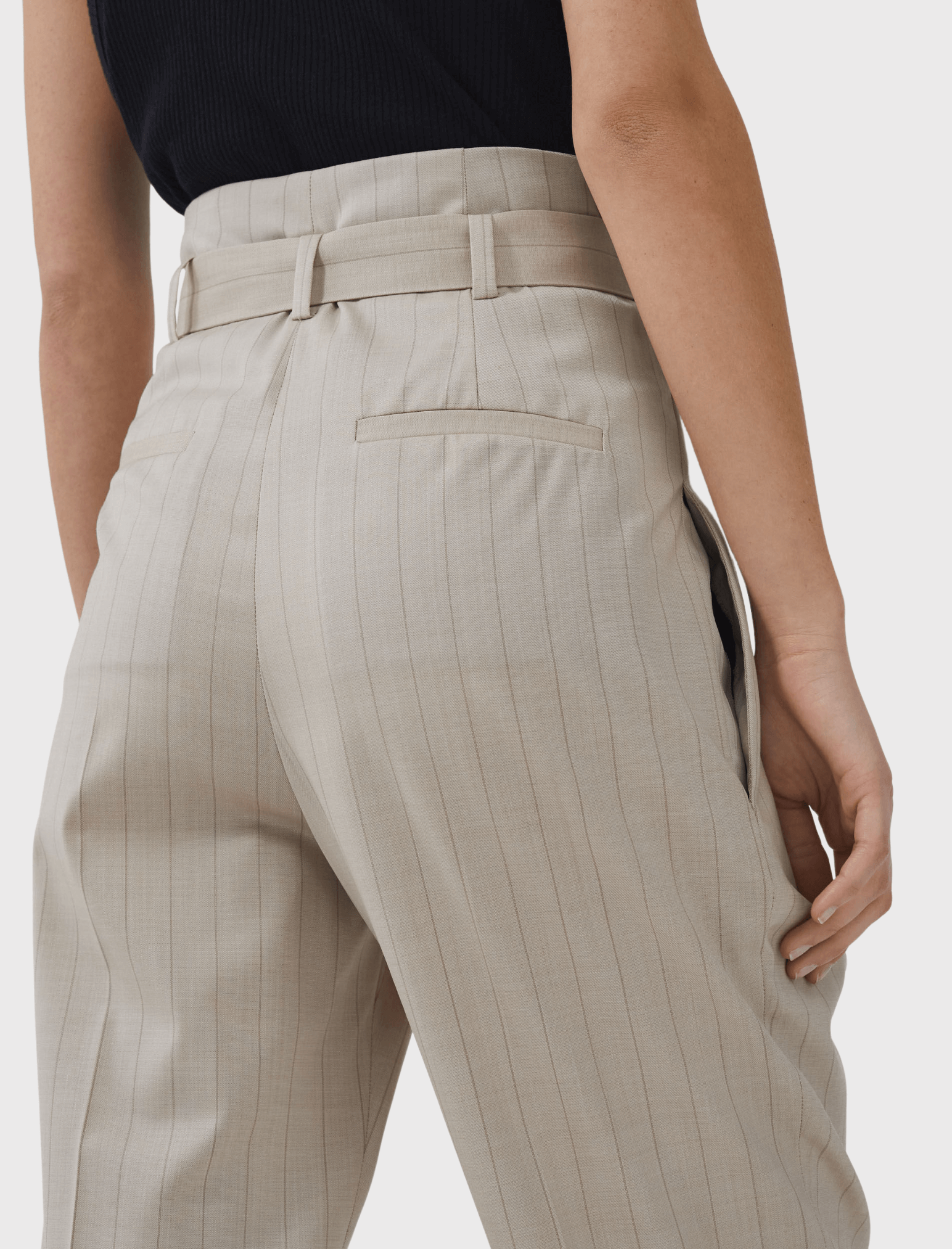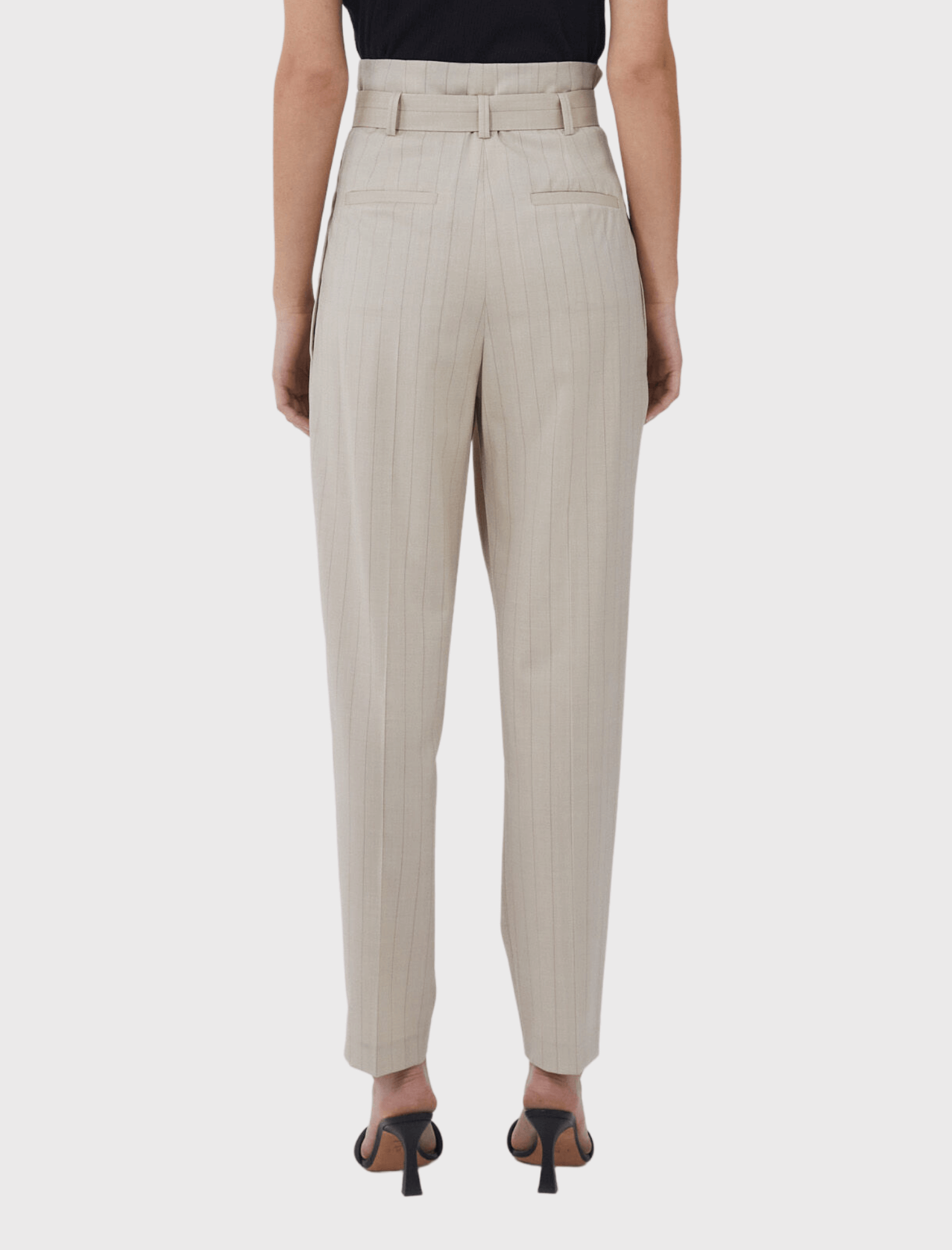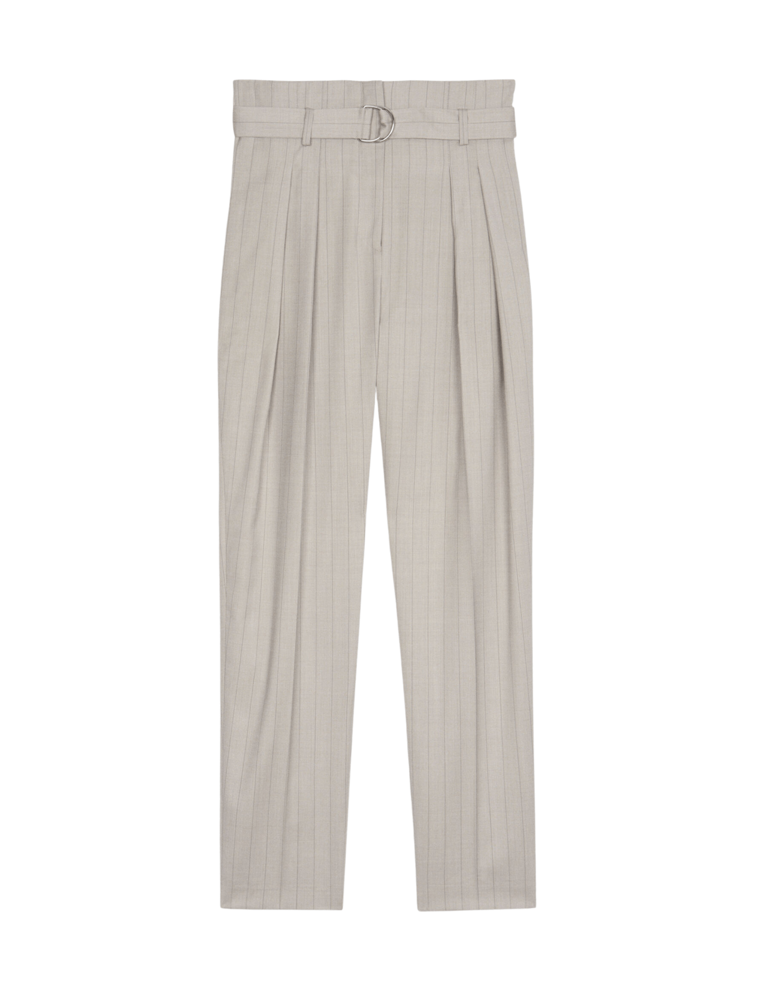 The cozy Igna Pant from IRO are a high waisted pant with a paperbag waist and a self fabric belt. The pant is constructed from a mid-weight suiting fabric with a subtle white stripe on a beige ground. Front pleats, concealed pockets and a narrow tapered ankle complete the silhouette. Match back with the IRO Imma Blazer to complete the look.