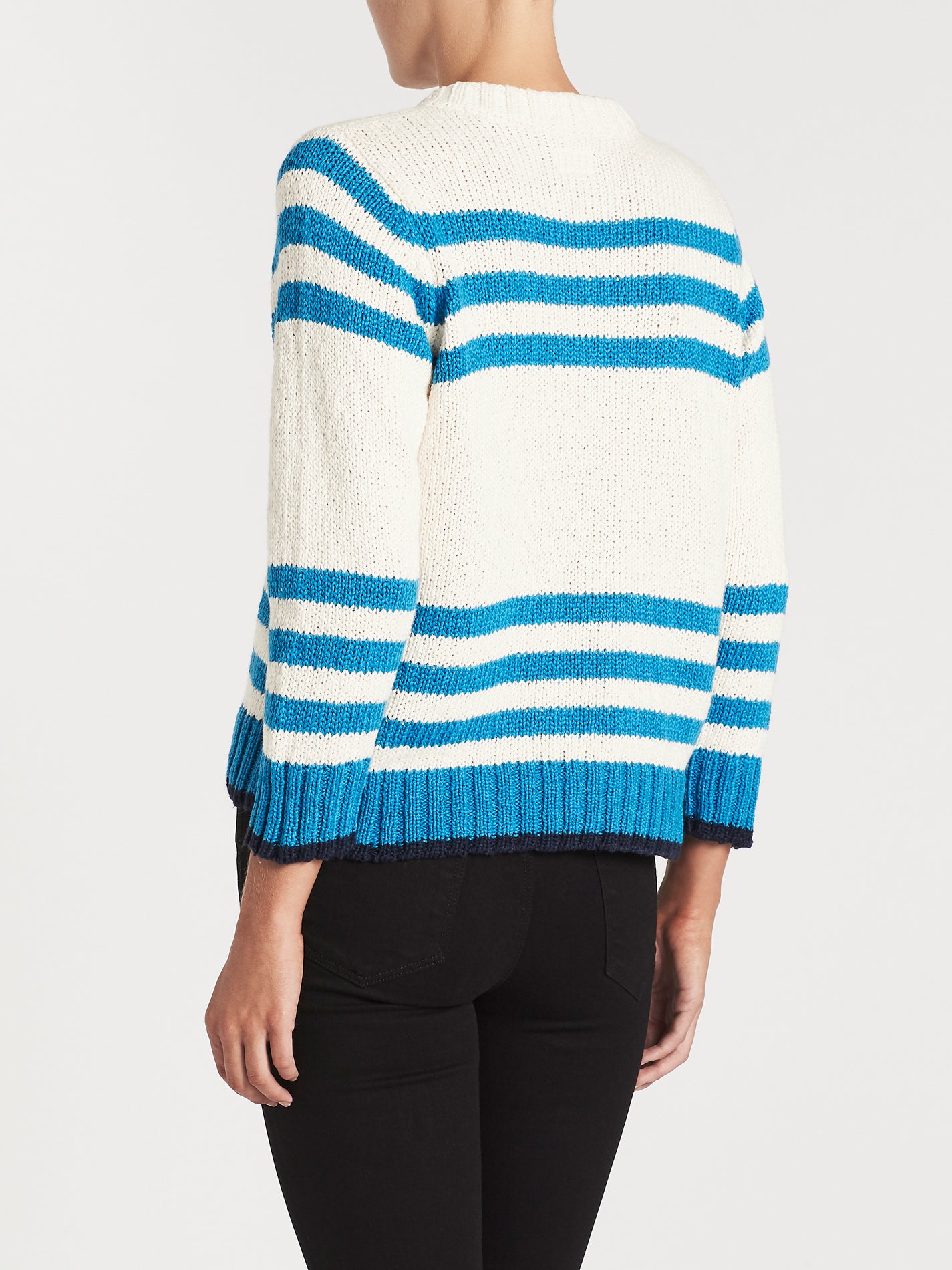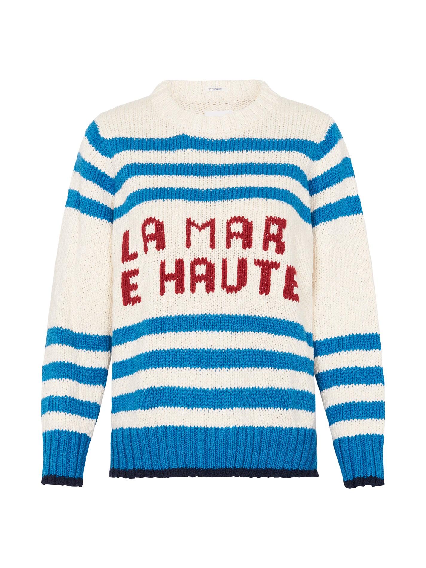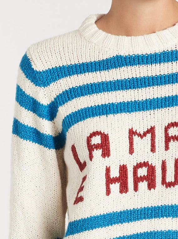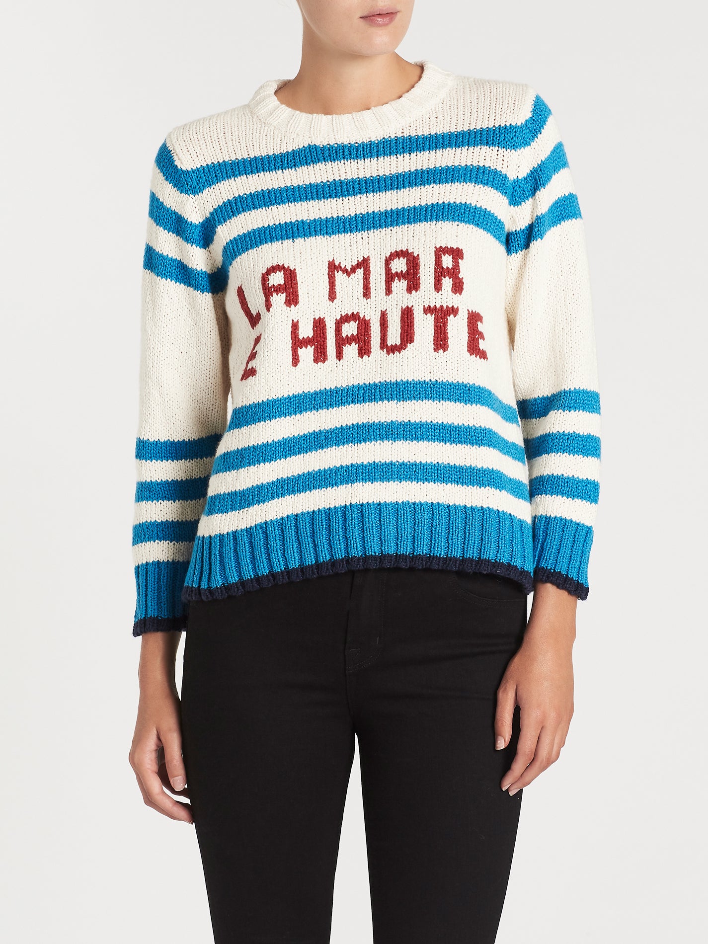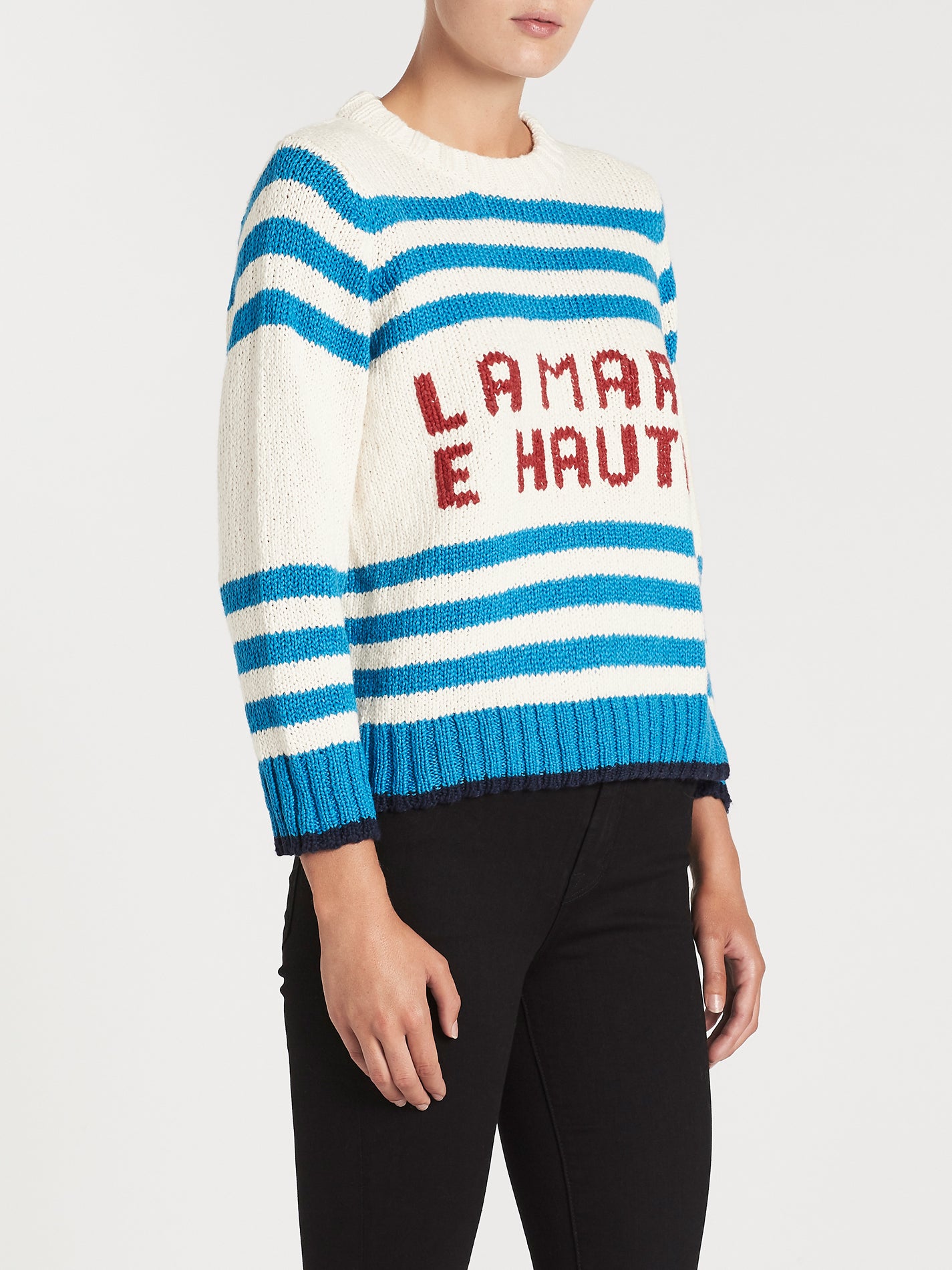Keep cozy in the Mother Denim The Jumper in La Mar. Constructed from a knitted cotton this piece features a rounded neckline, ribbed finishings, a nautical inspired stripe and is finished with the words "La Mar e Haute". Team with your favourite denim jeans to complete to look.