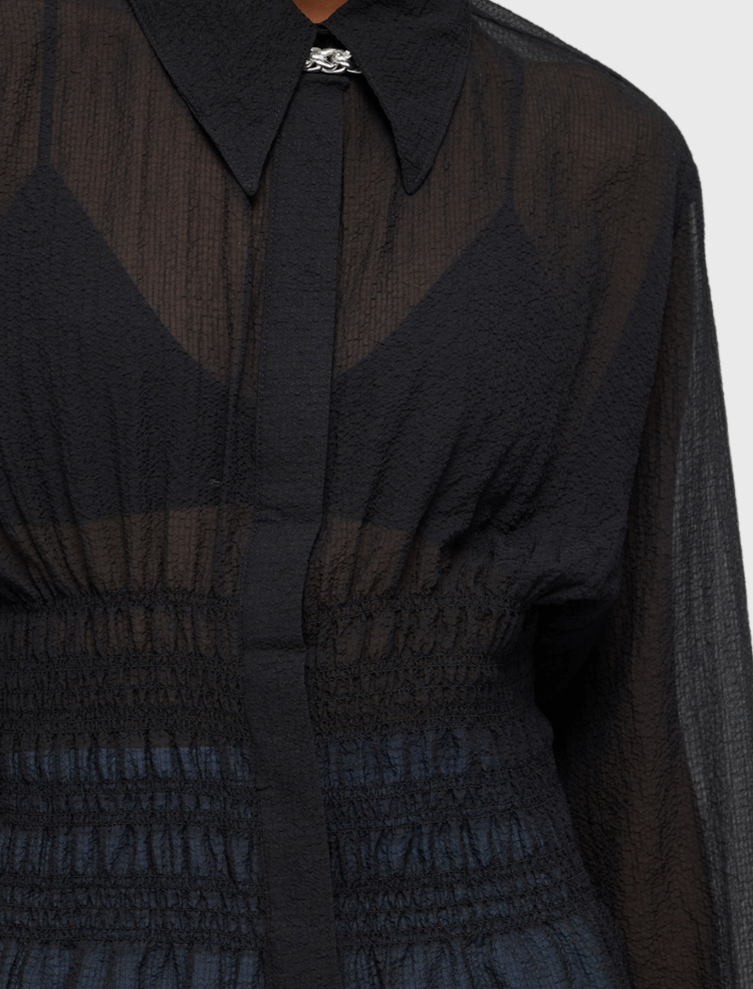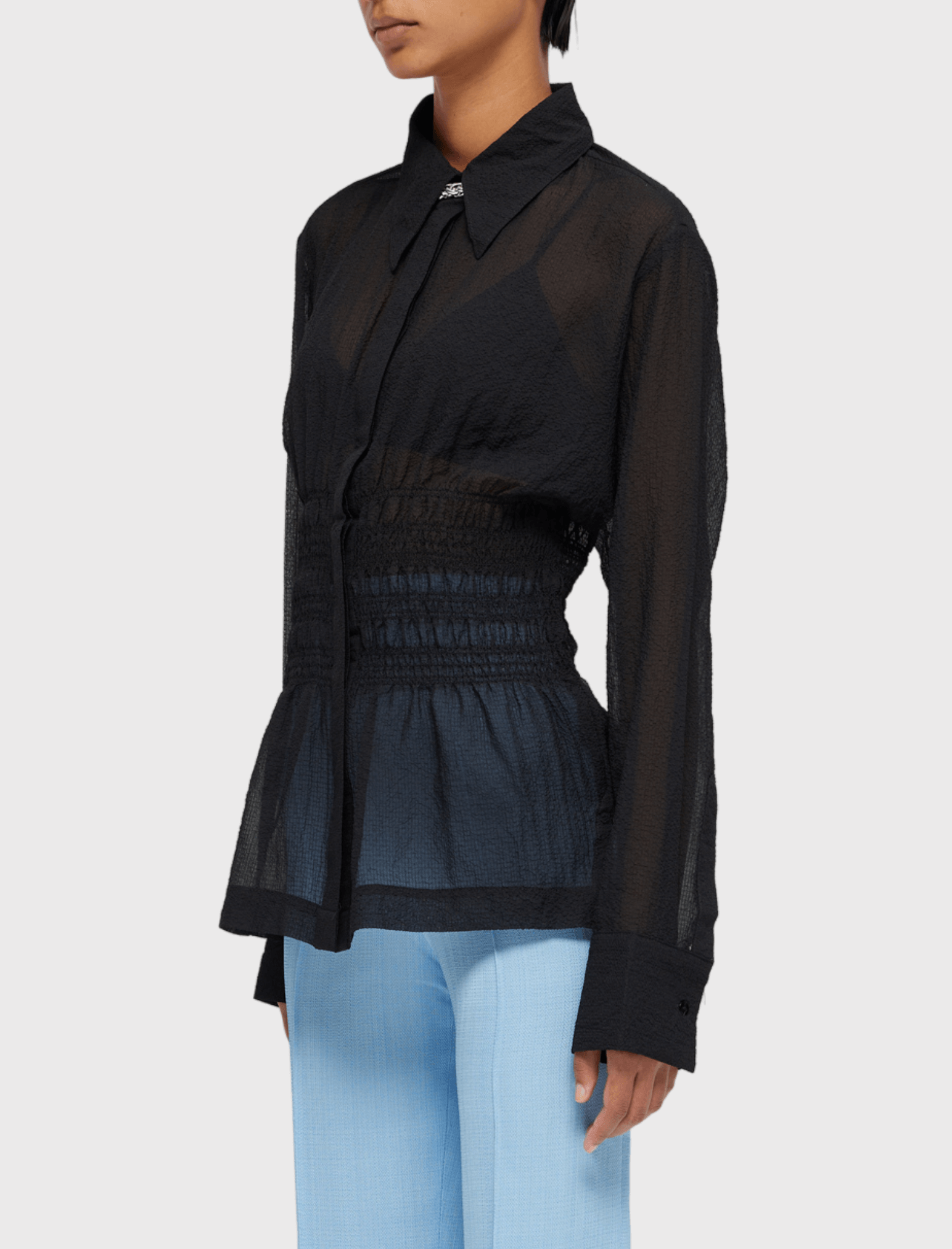 We are obsessed with this statement piece from Róhe! The Róhe Smocked Waist Blouse in Noir is a timeless top that will withstand the ebb and flow of fashion trends. The Smocked Waist Blouse has a collared neckline, a smocked waist, button closure on the sleeve, and is made from a light seersucker ripstop from Japanese mill StyleM. Please note that this item is sheer.