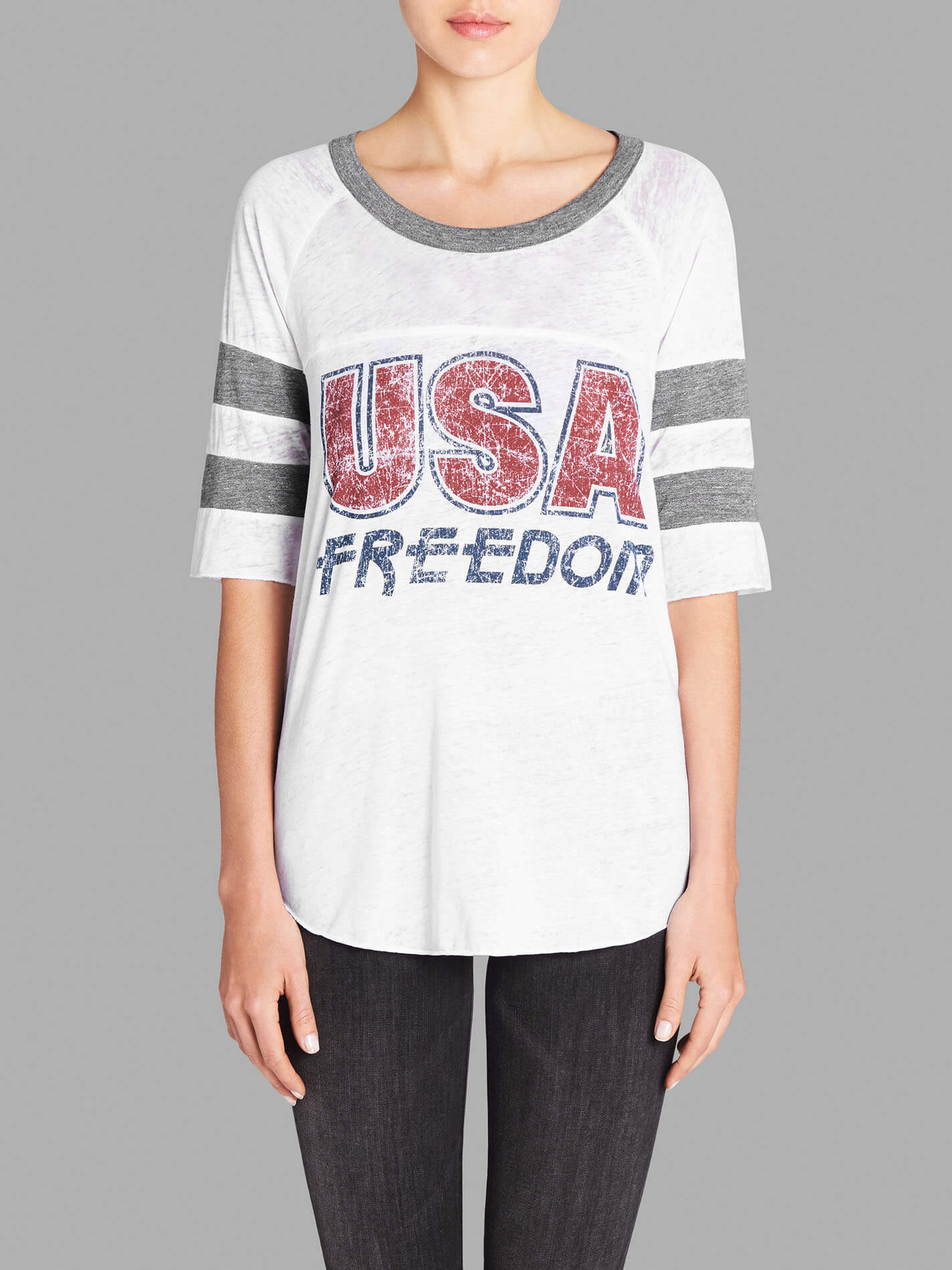 A patriotic statement piece that's also supremely comfortable, the Chaser Freedom Top in White is made in the USA. This ultra-comfy, round-neck tee is patriotically pretty with its bold red, white, and blue graphic print. The lightweight, soft-touch fabric makes it a perfect choice for everyday wear. Pair this top with your favorite denim shorts or a casual skirt for an effortless and stylish look, ideal for summer barbecues or holiday celebrations.