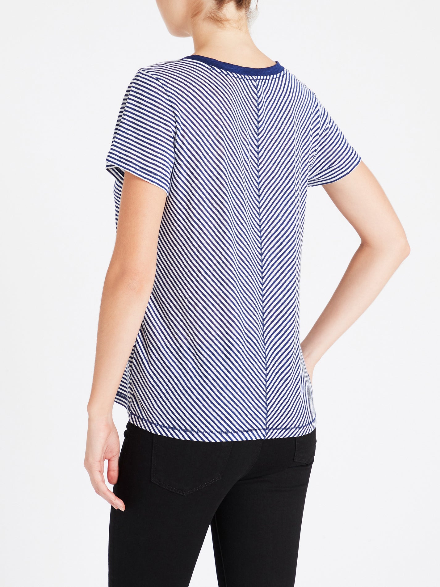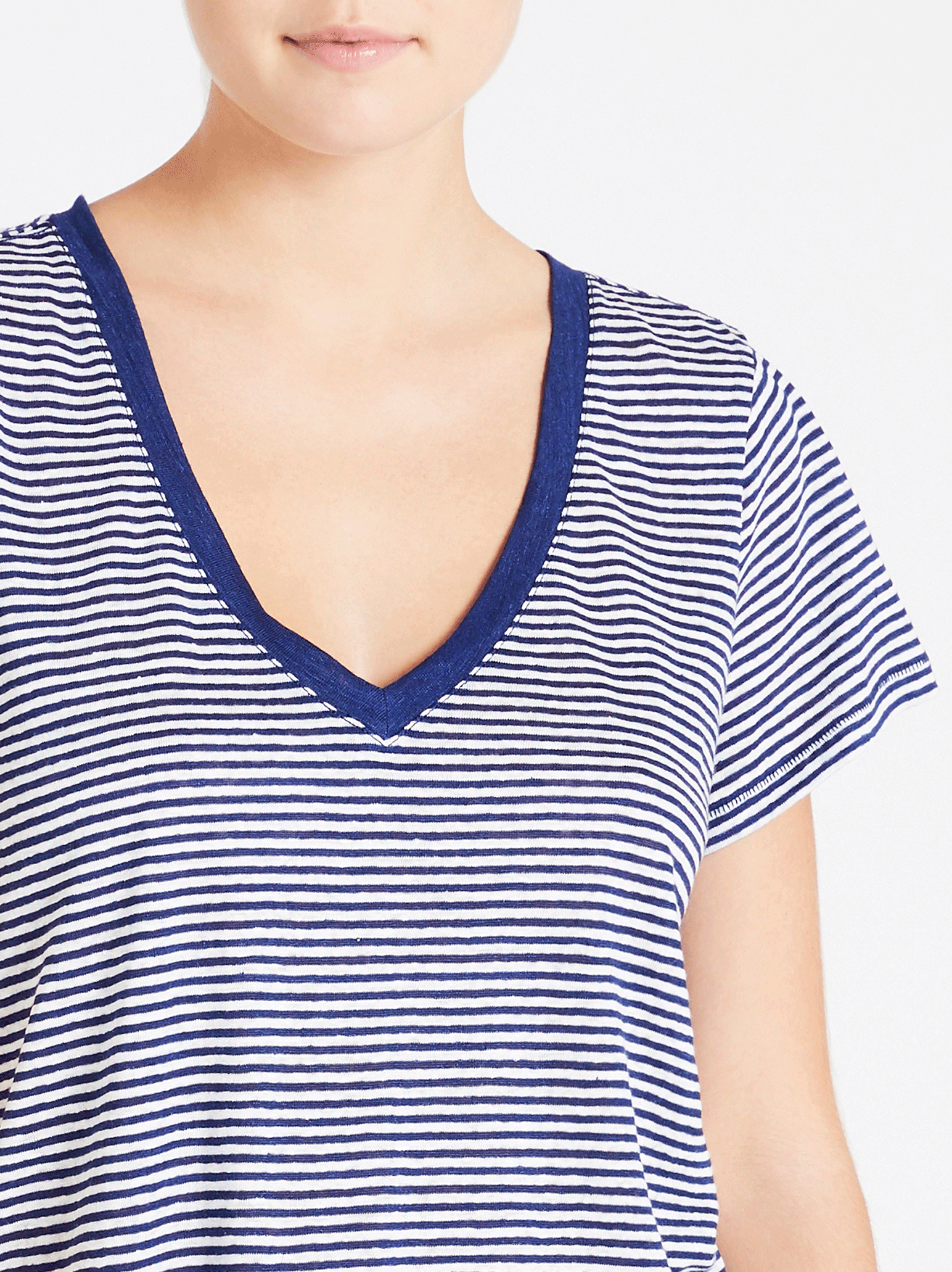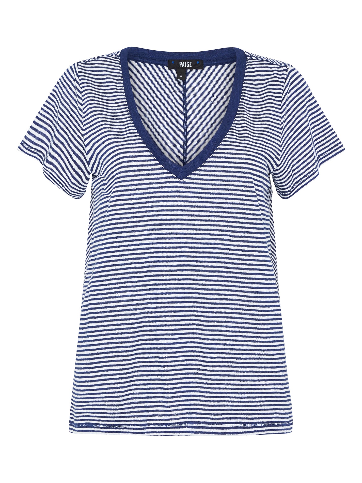 Loosen up with the Zaya Tee in Dark Ink Blue/White stripe from Paige. In a V neck shape with a contrasting neckline and exposed stitching, the Zaya Tee is made from a smooth linen material and teams to perfection with your favourite pair of denim jeans.