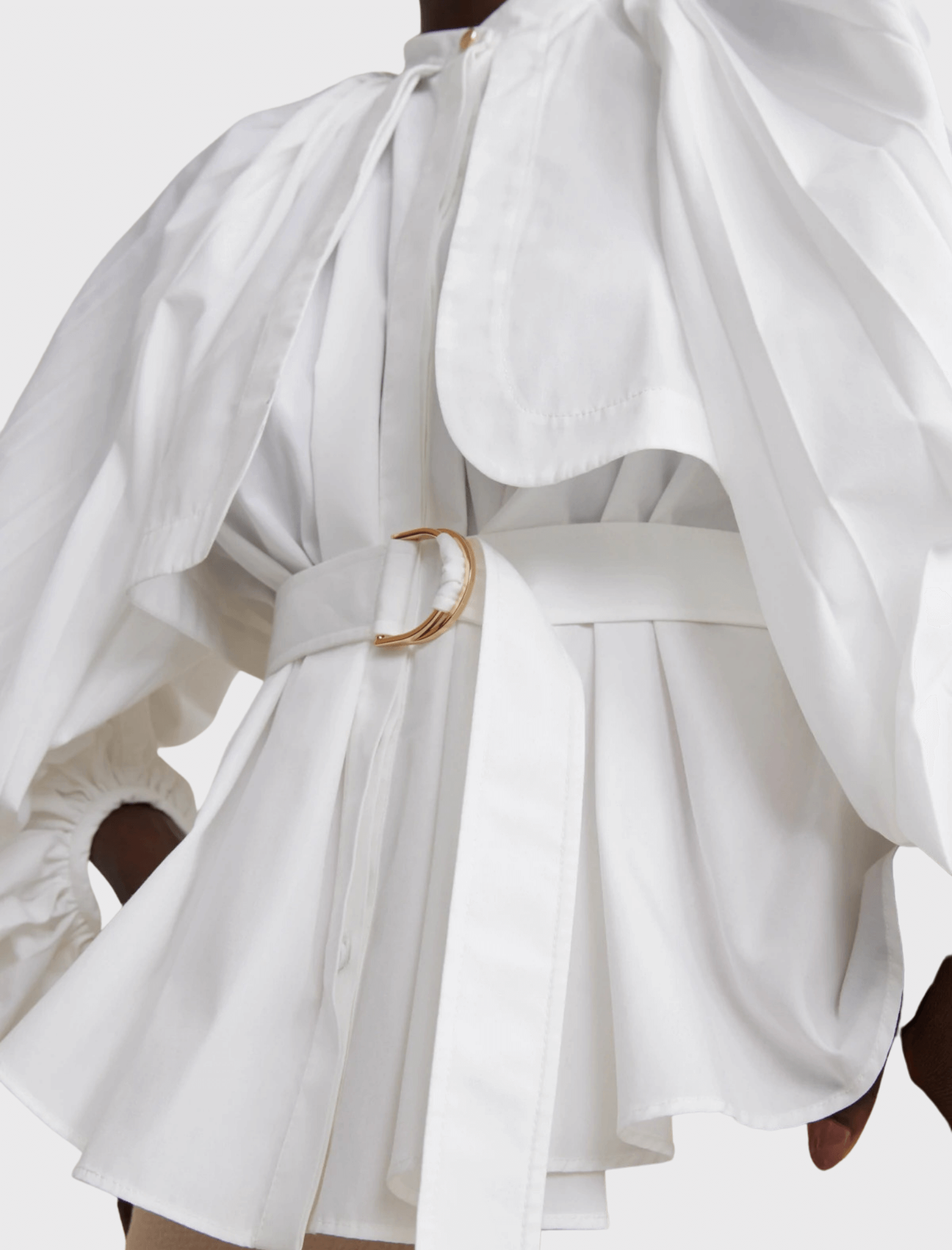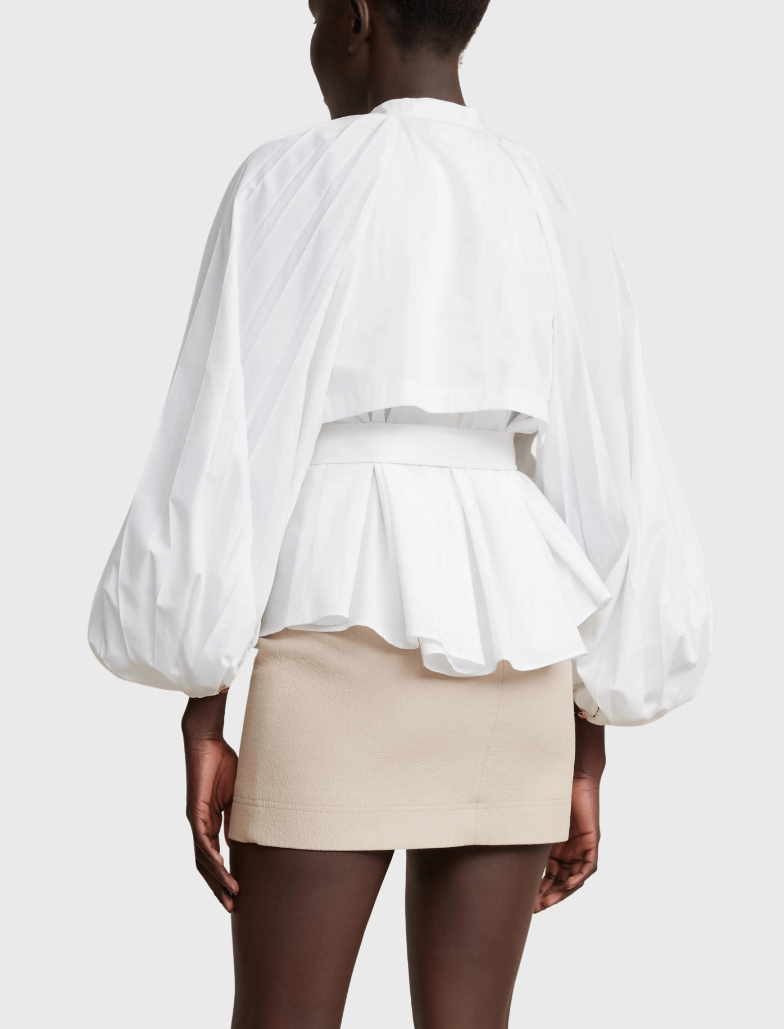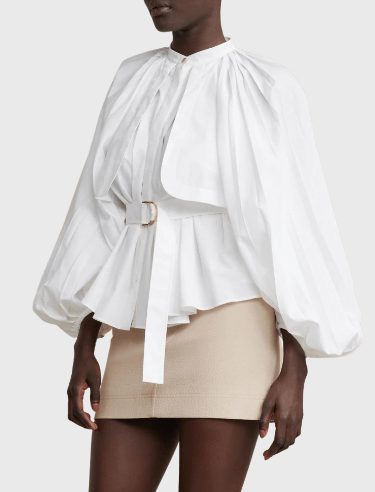 The architecturally inspired Ivy Shirt from Adelaide based design house Acler is a artful re-invention of a classic white shirt. Made from a crisp linen blend fabrication, the shirt has a charming pleated balloon style bracelet length sleeves, a priest's collar with gold button detail and loose lapel panels that create a layer of sculpture. The shirt is completed with an adjustable belt to cinch the waist in. Signature pleating adds texture to this elevated style.