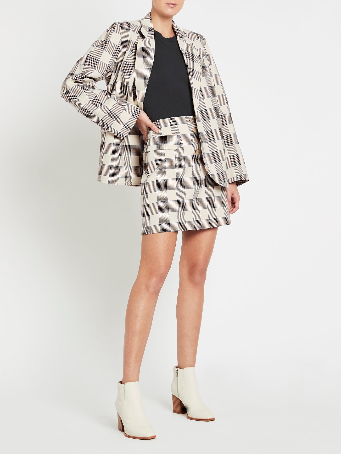 Baum Und Pferdgarten deliver a wardrobe hero piece with the Becks Jacket in Cream Navy Brown Checks. Crafted from a soft polyester blend, this loose fitted blazer features an asymmetric single button closure and is finished with a classic peaked collar and duel pocket flaps. Layer over a simple tee and trousers for a relaxed WFH inspired style or complete the look and pair with the The Baum Und Pferdgarten Shani Skirt.