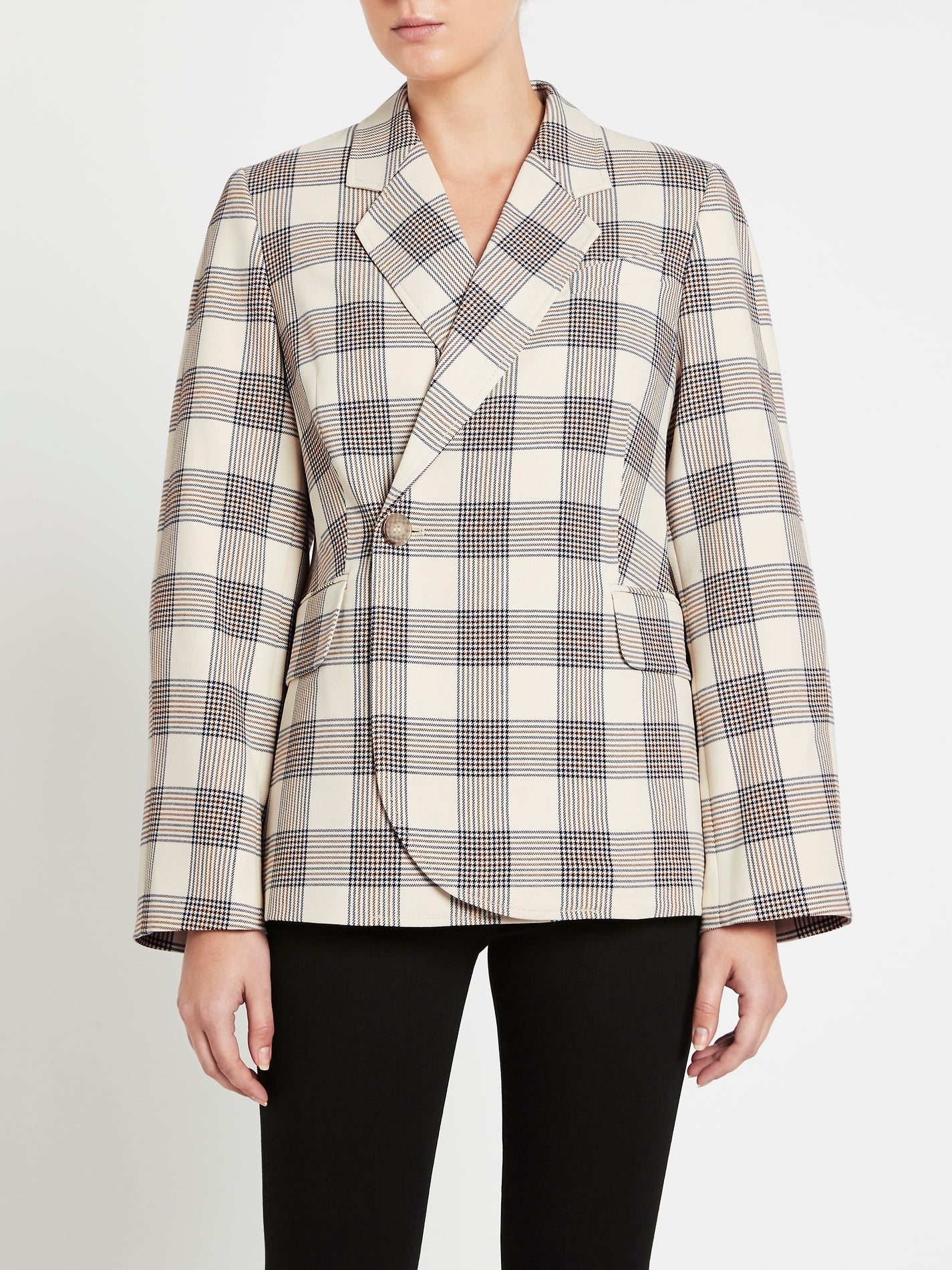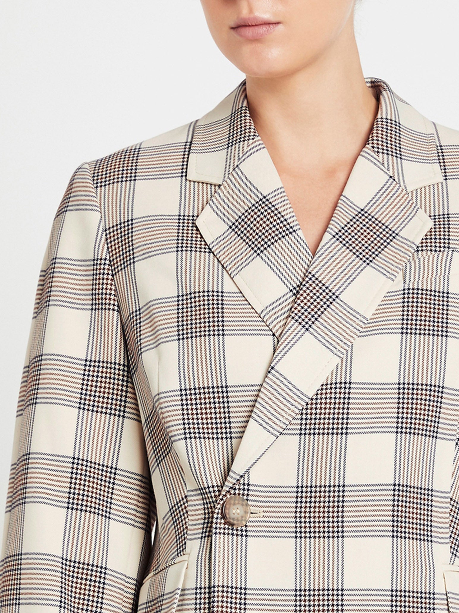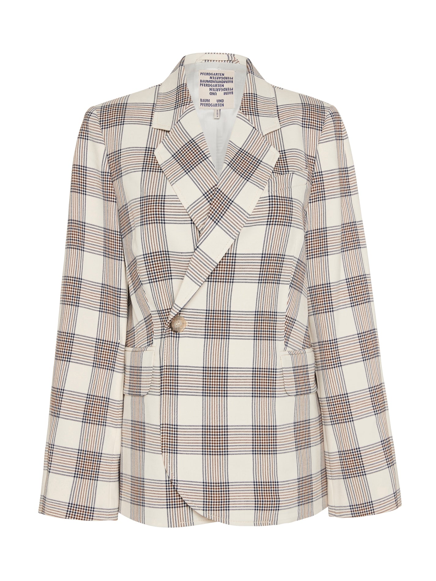 The Baum Und Pferdgarten Becks Jacket in Cream Navy Brown Checks is made from 69% Polyester, 30% Viscose with a 100% Viscose lining