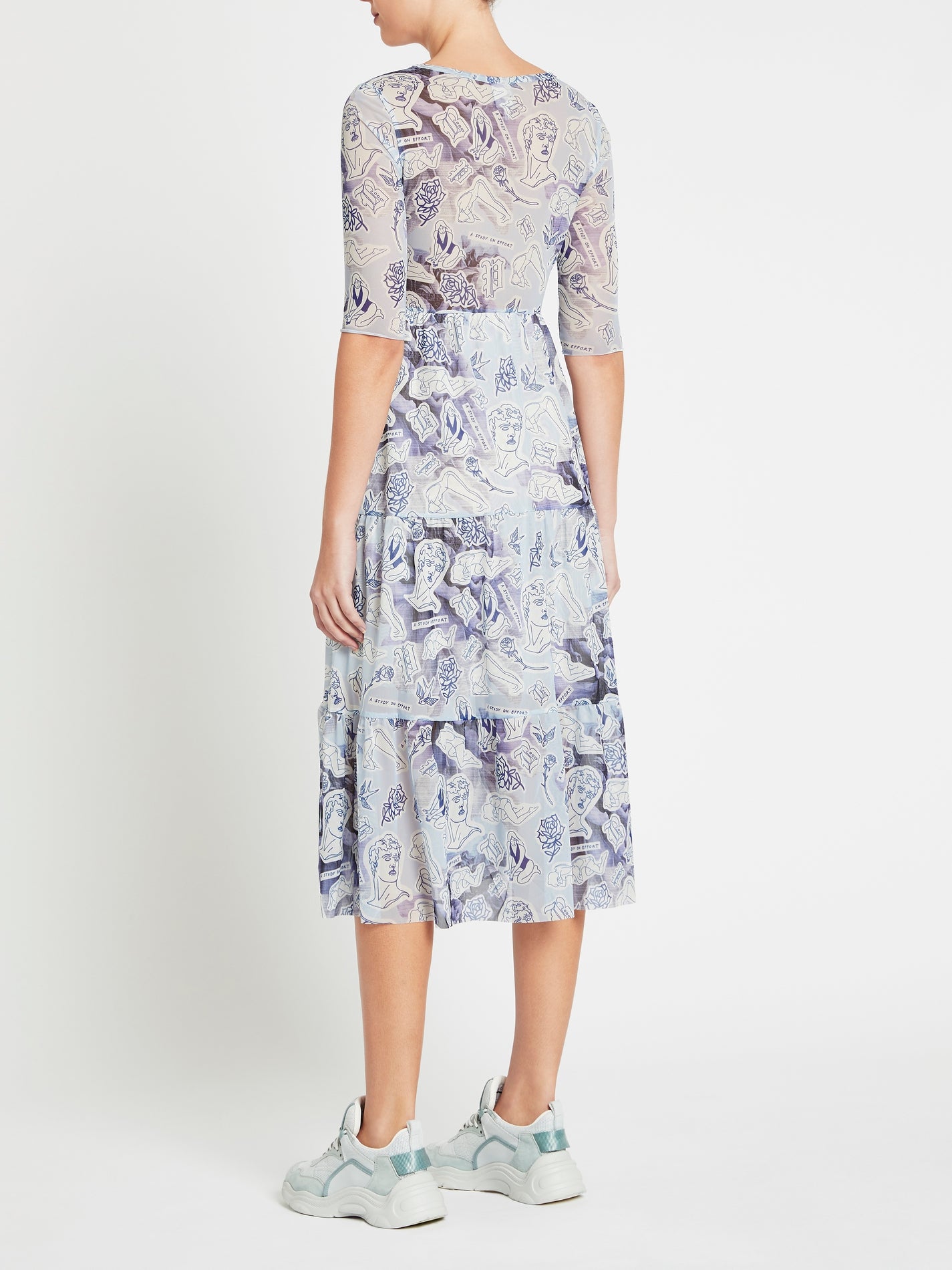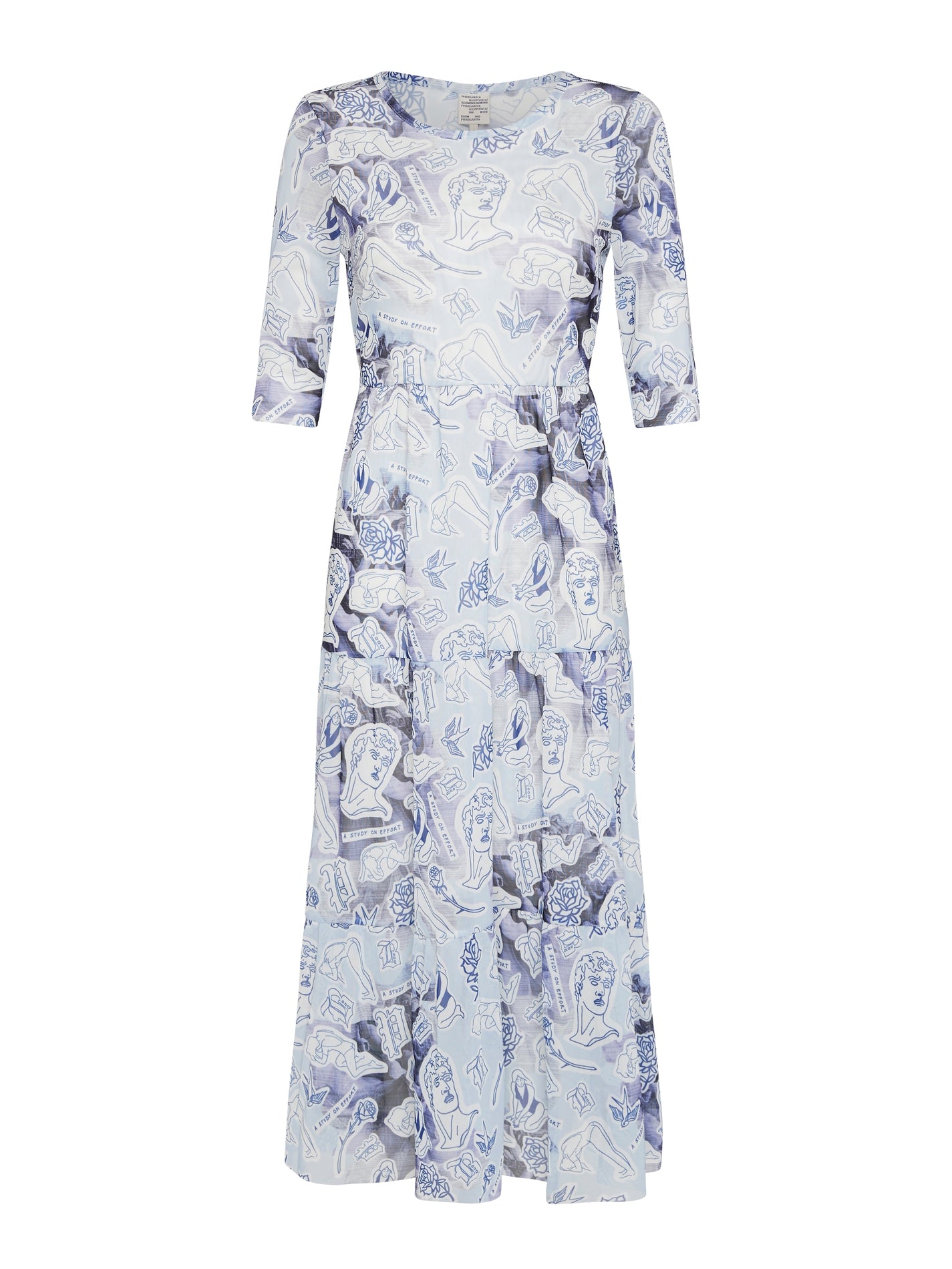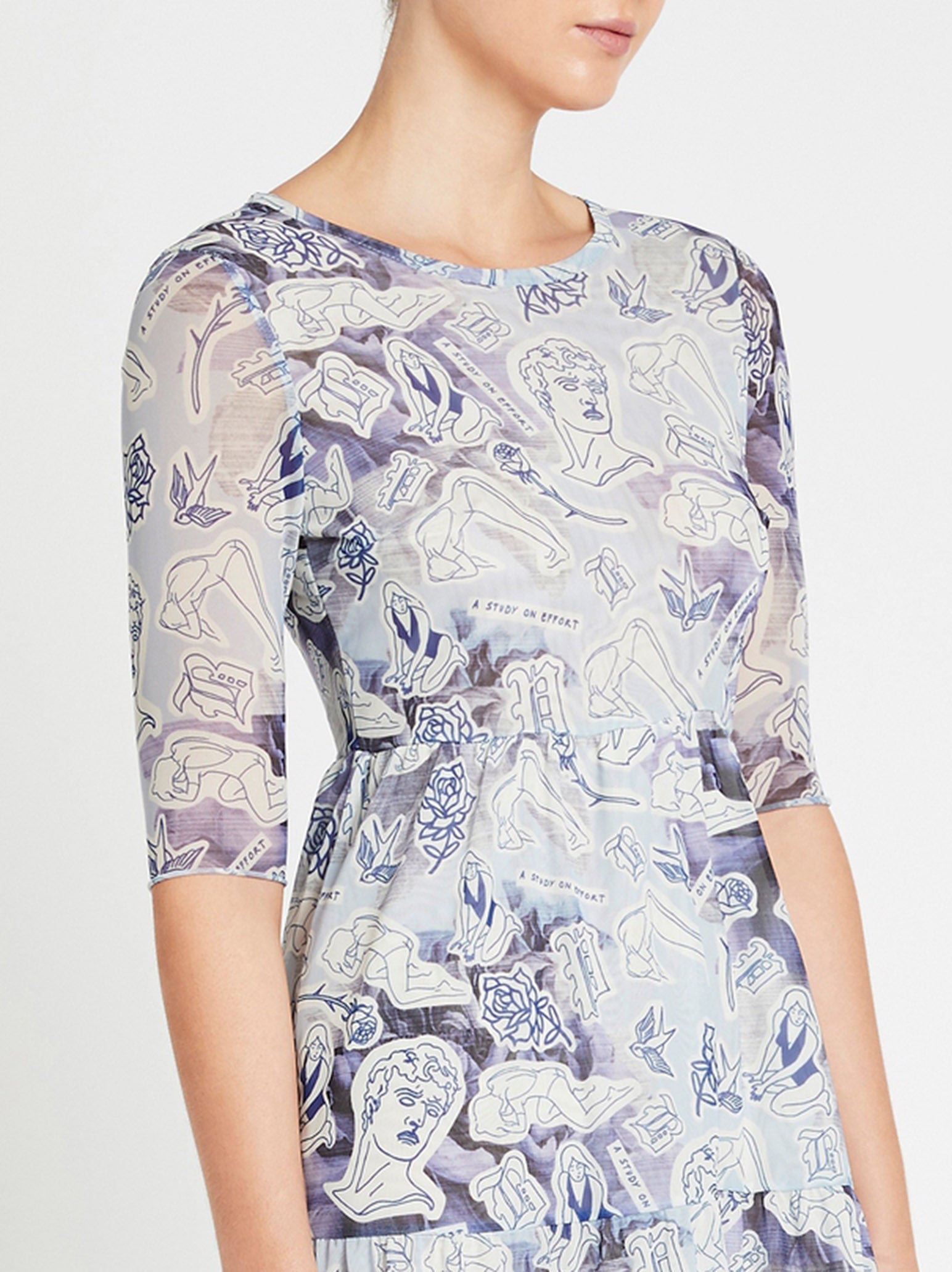 Keep it le femme but amp up the artistic glam in the Jones Dress in Lilac Rose Tattoo by Baum Und Pferdgarten. Constructed from recycled polyester, this sustainable mesh midi dress features a round neckline, 3/4 sleeves and a fitted waistline with finishes of a playful tattoo inspired print and a flared skirt. Team with your favourite sneakers and layer with a leather jacket for a look that will take you from day to night.