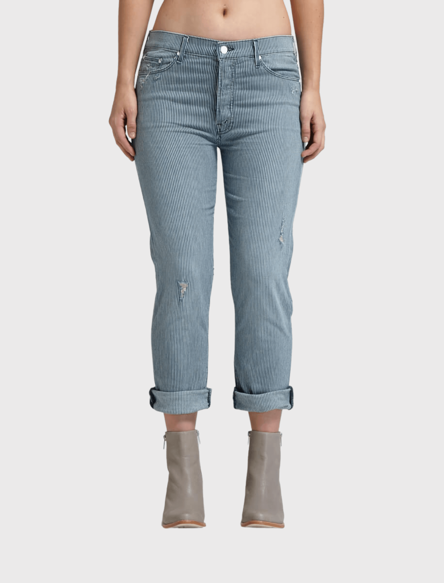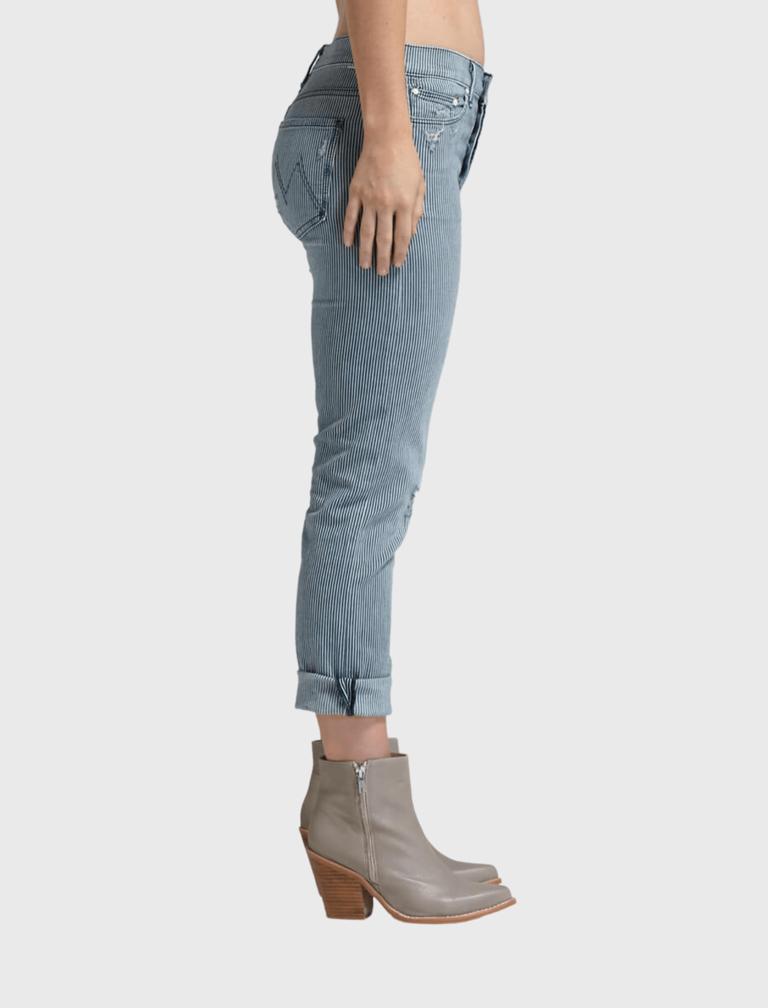 Smell like teen spirit in the MOTHER Vagabond Jean in On The Road Destroy. These grungy vertical blue and white striped jeans are a slim fitting boyfriend style which feature 5 pocket styling, zip and button fly with destroyed patches and intentional holes across the thighs.