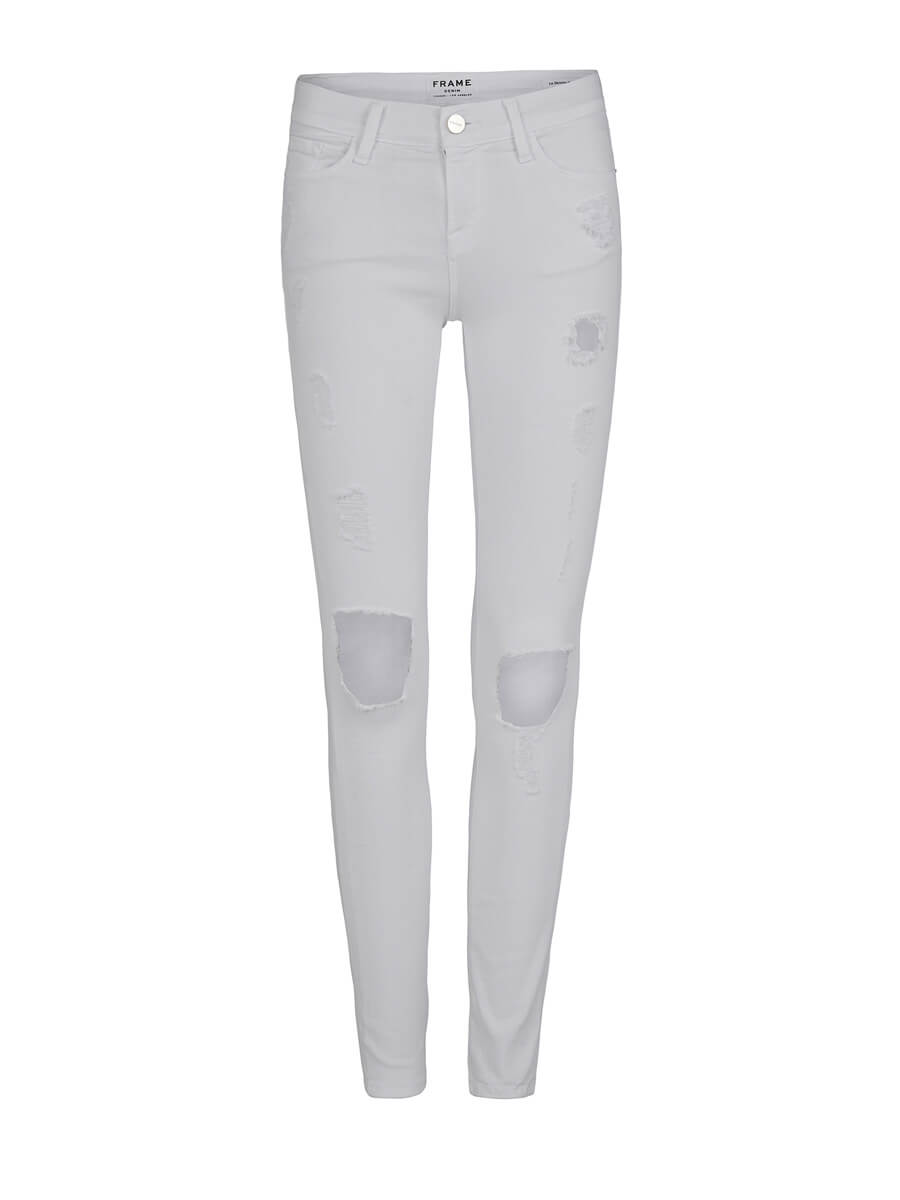 These white Le Colour Destroy Jean by Frame Denim are a skinny leg pant with a low rise 8 inches. They are embellished with gold hardware and feature rips on the knees, and are slightly destroyed along the thighs.