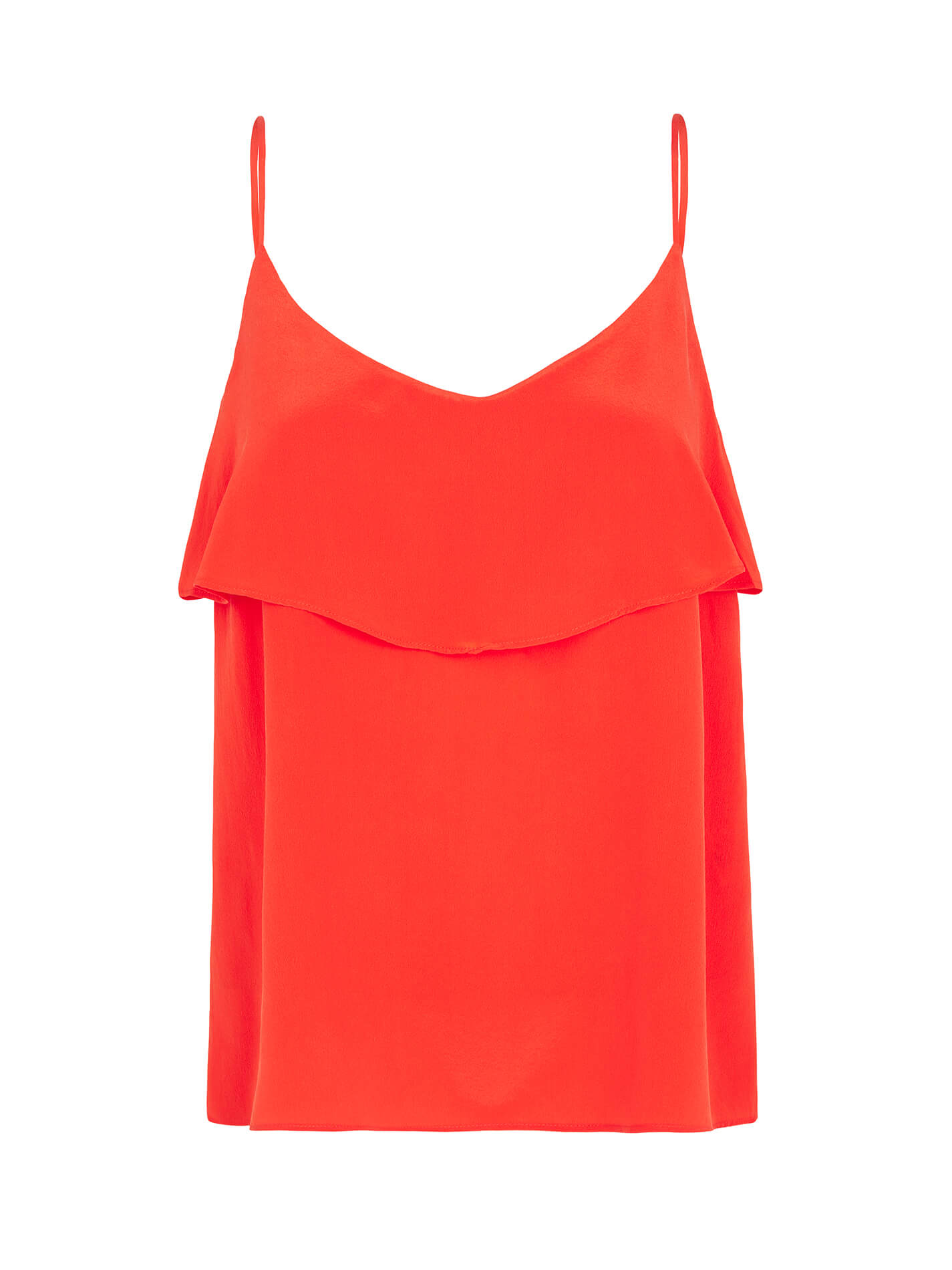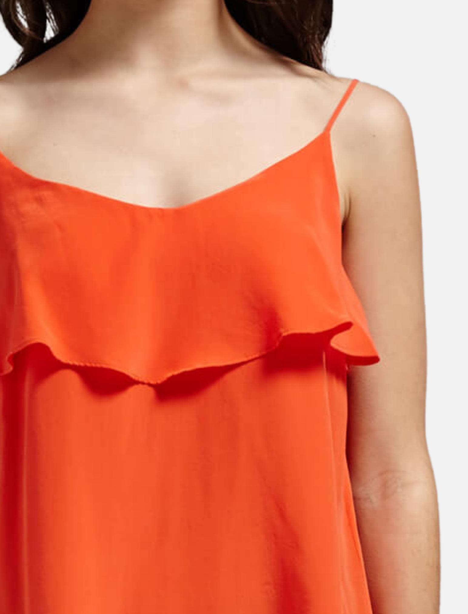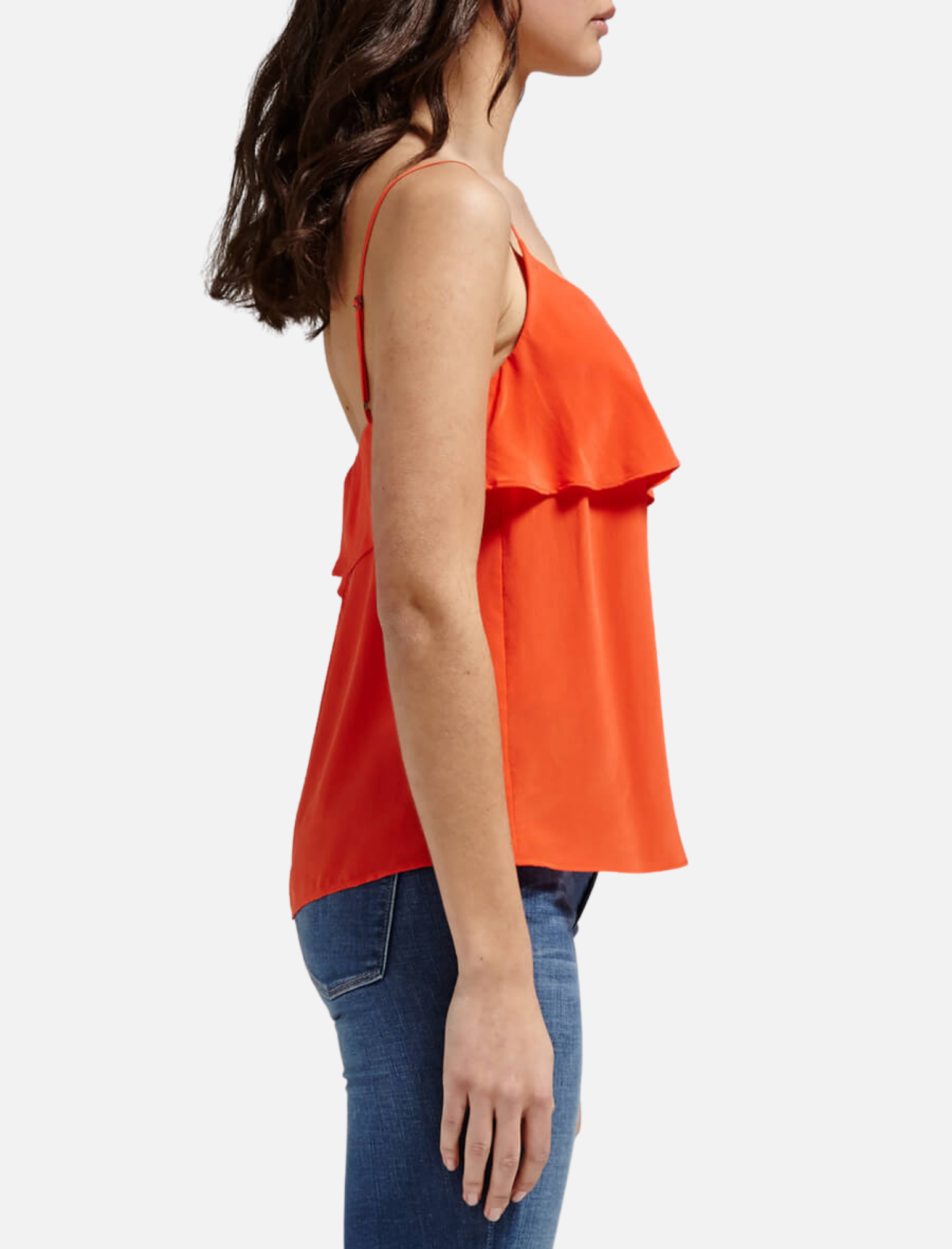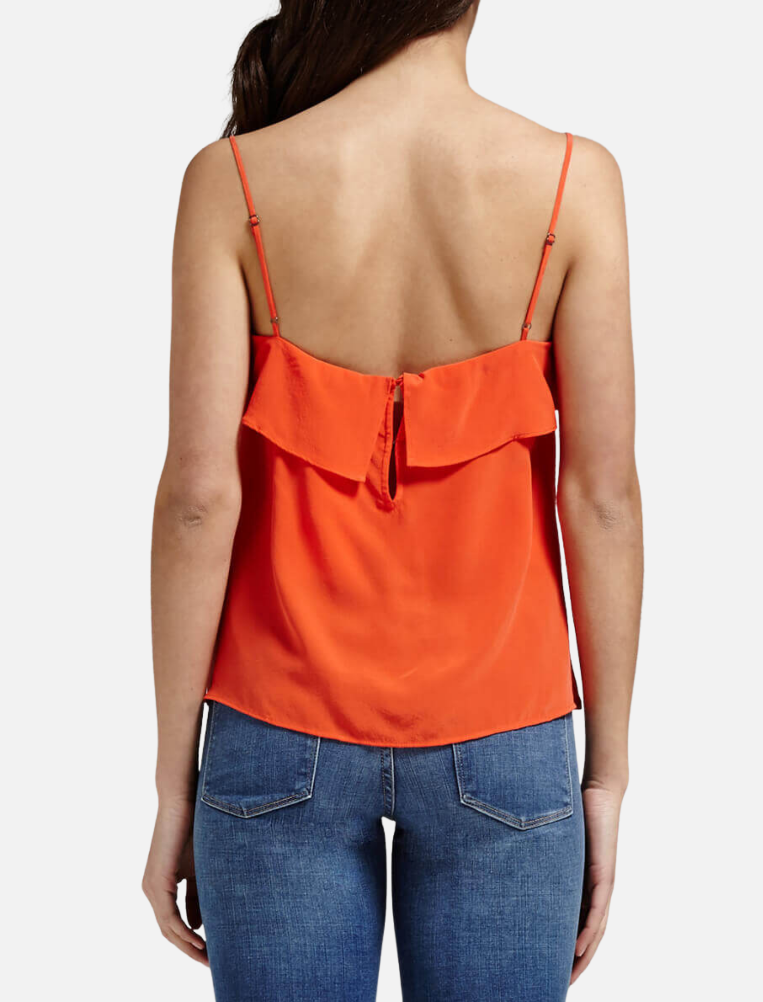 Fresh and flowy, the silk Abelia Strappy Frill Layer Cami by Joie comes in a bright orange-red color. With it's back keyhole detail, adjustable straps and button closure, this slight V neck top is full of detail. This cami also features frill layer detail.