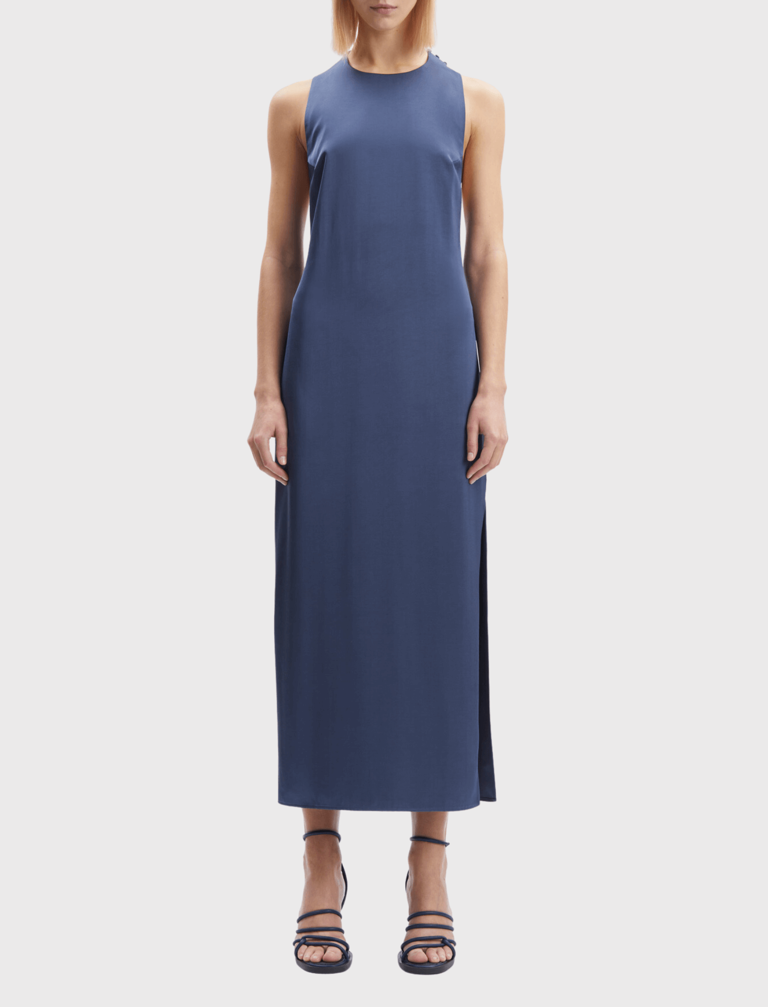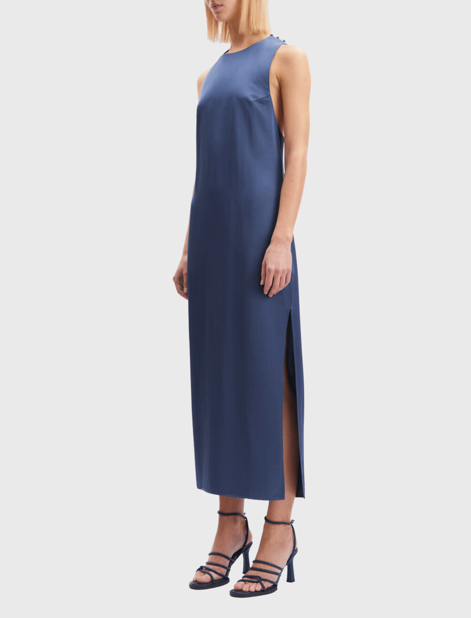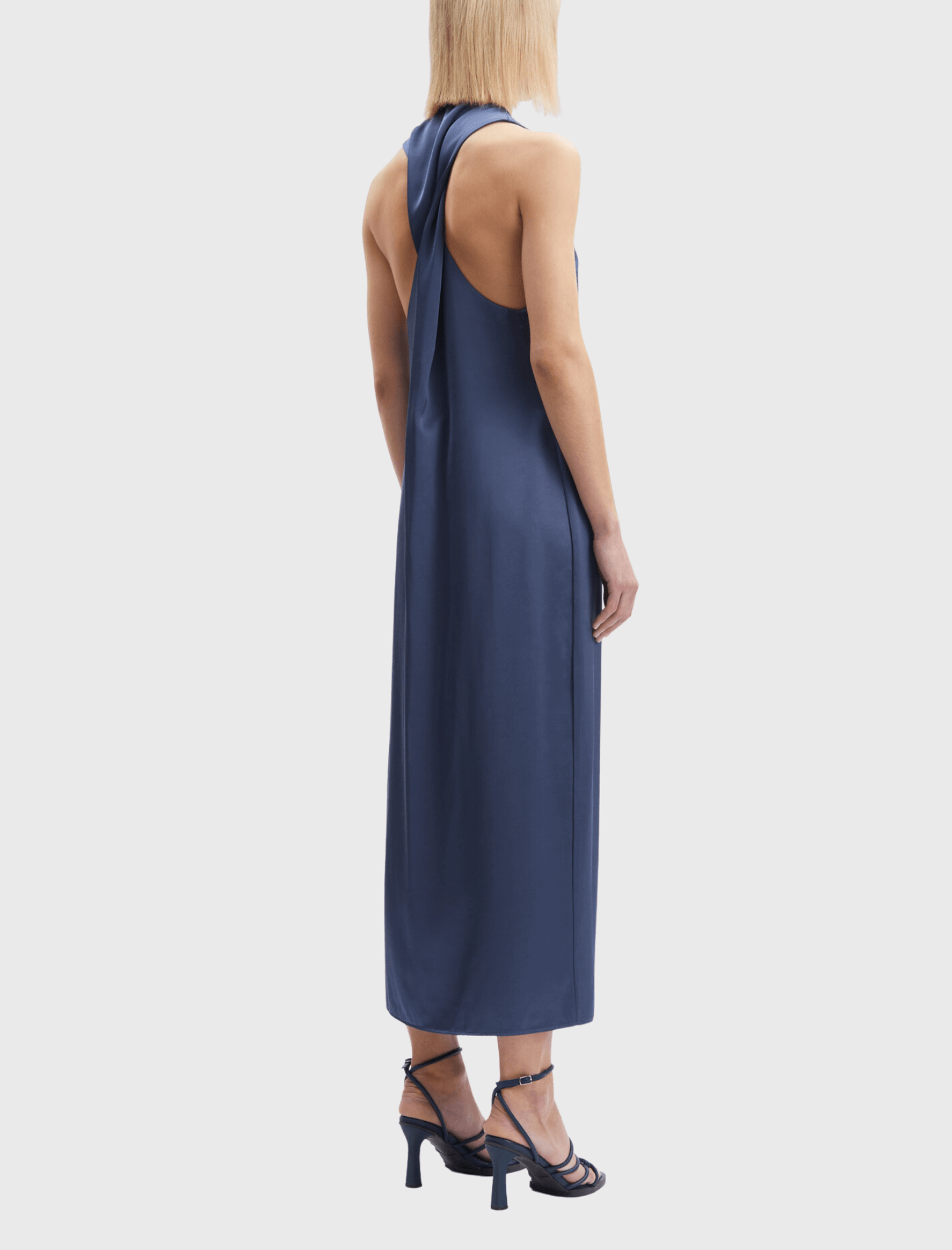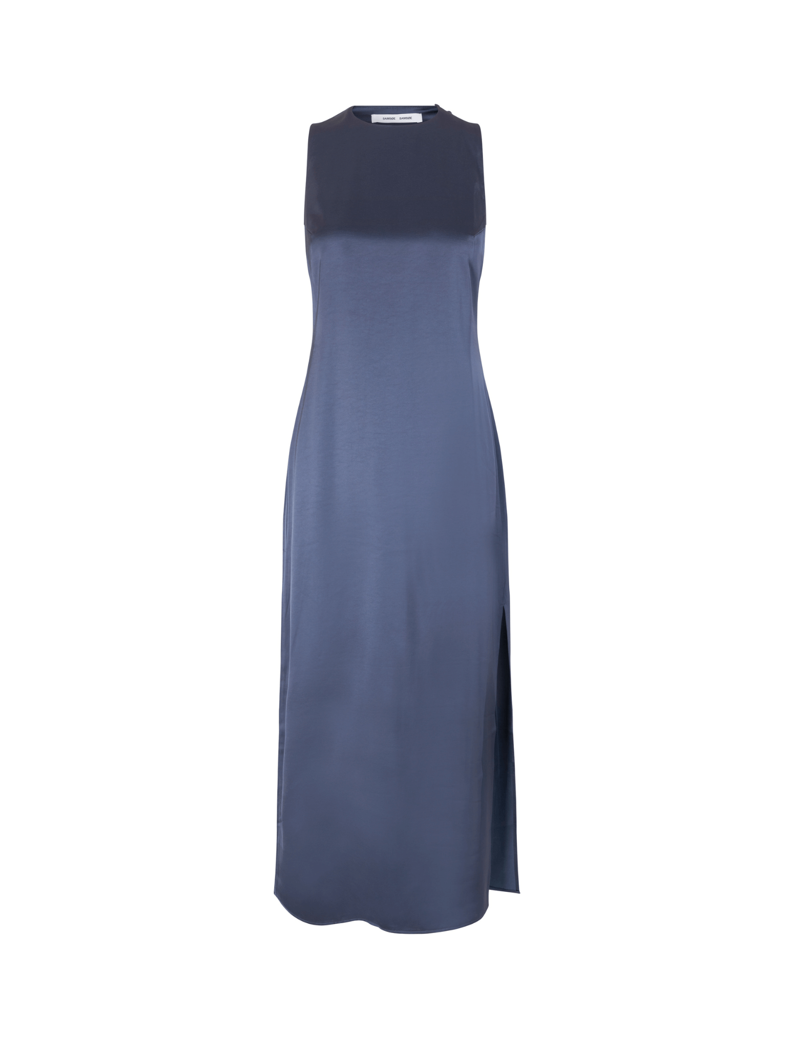 Y'all wanted a twist? The Samsoe Samsoe Ellie Dress in Nightshadow Blue is here to elevate your aesthetic. This regular fitting sleeveless midi dress features a twisted back detail. Combined with the round neckline with covered button fastening on the shoulder and a side sam hem slit, this stunning midi dress will turn heads.
