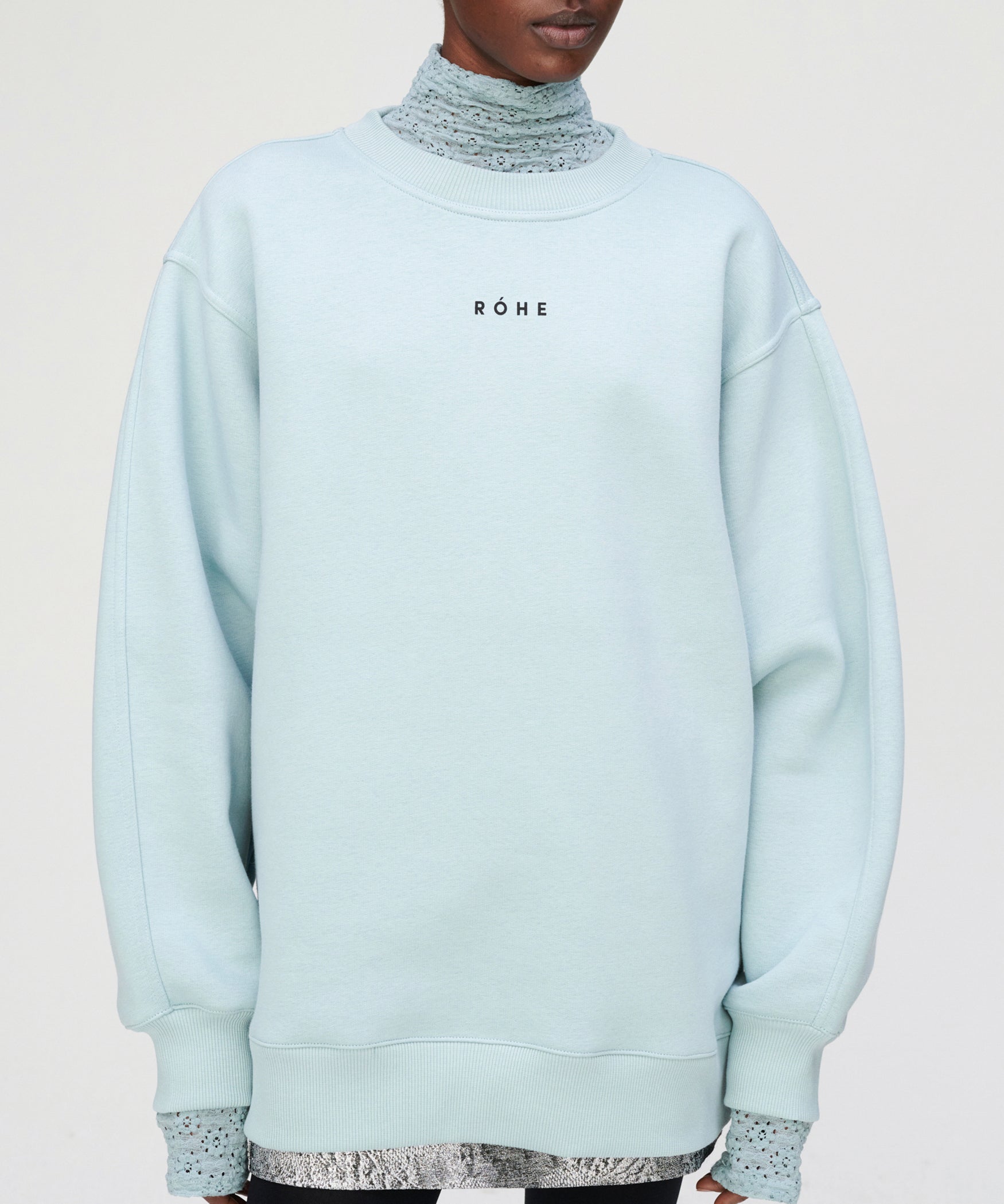 Slack Off in Style in the Róhe Uma Sweatshirt in Jade. Made from organic cotton and recycled polyester, the Róhe logo sweatshirt is an oversized fit with a special sleeve-seam. Pair with your favourite jeans for an off-duty look, or channel your inner Ariana Grande by pairing with a short skirt and knee high boots.