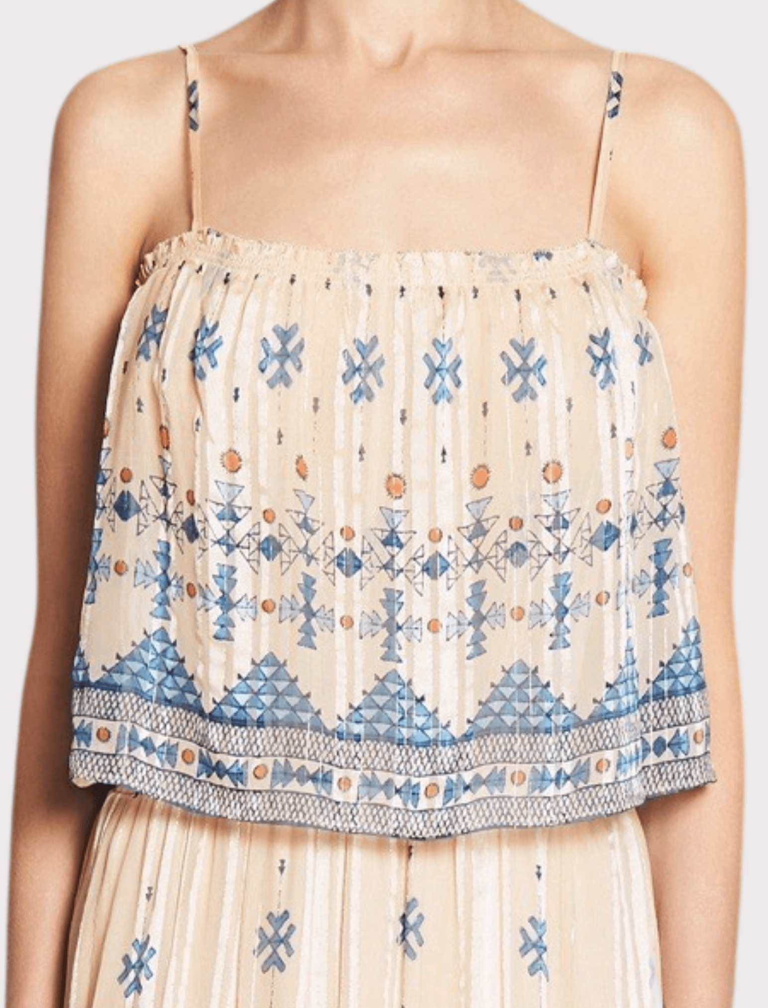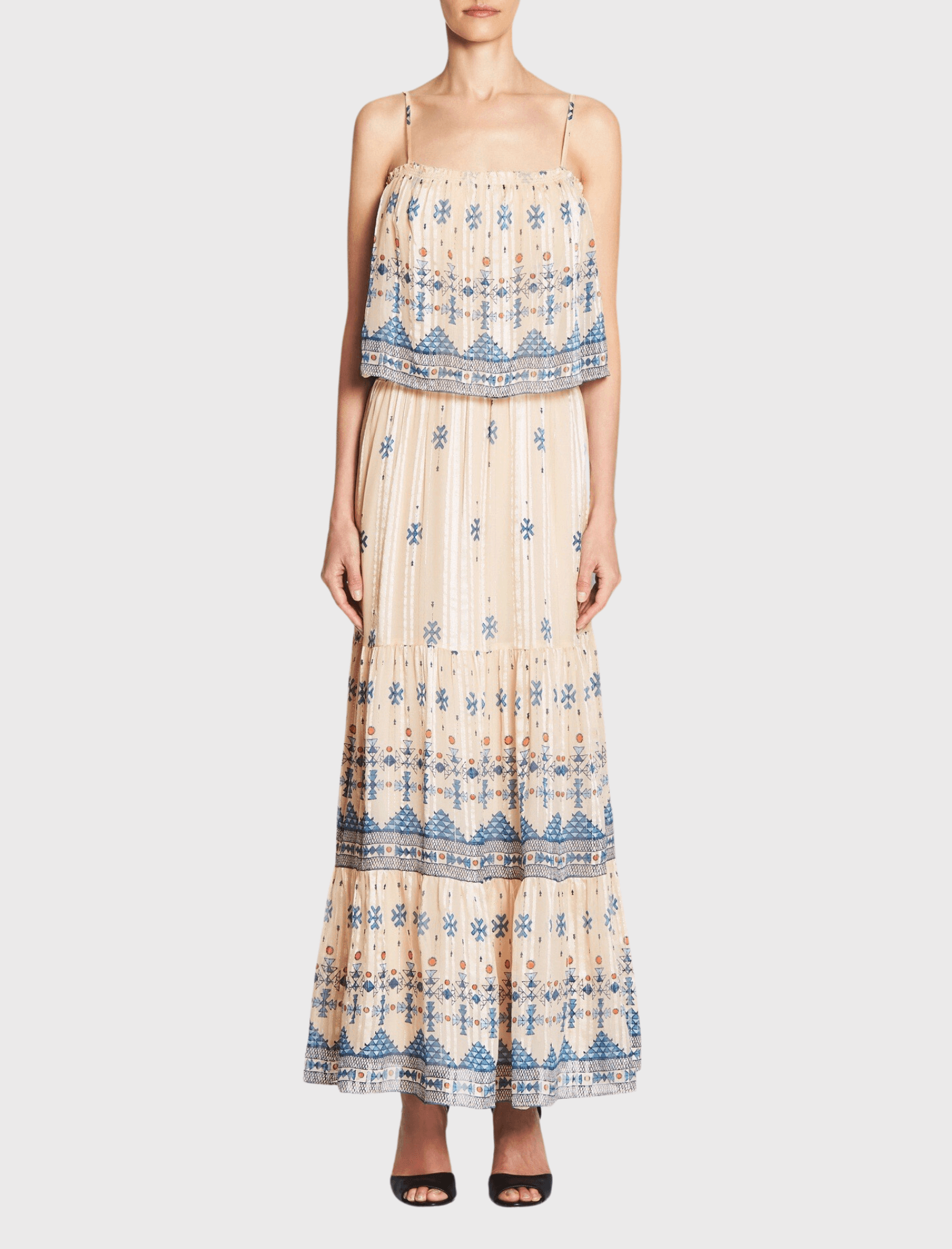Styled with a square neckline, an elasticated waist, overlay bodice and spaghetti straps, the Sorne B Dress by Joie is a pullover style and a elegant silk jacquard maxi dress with ruffled overlay detail.