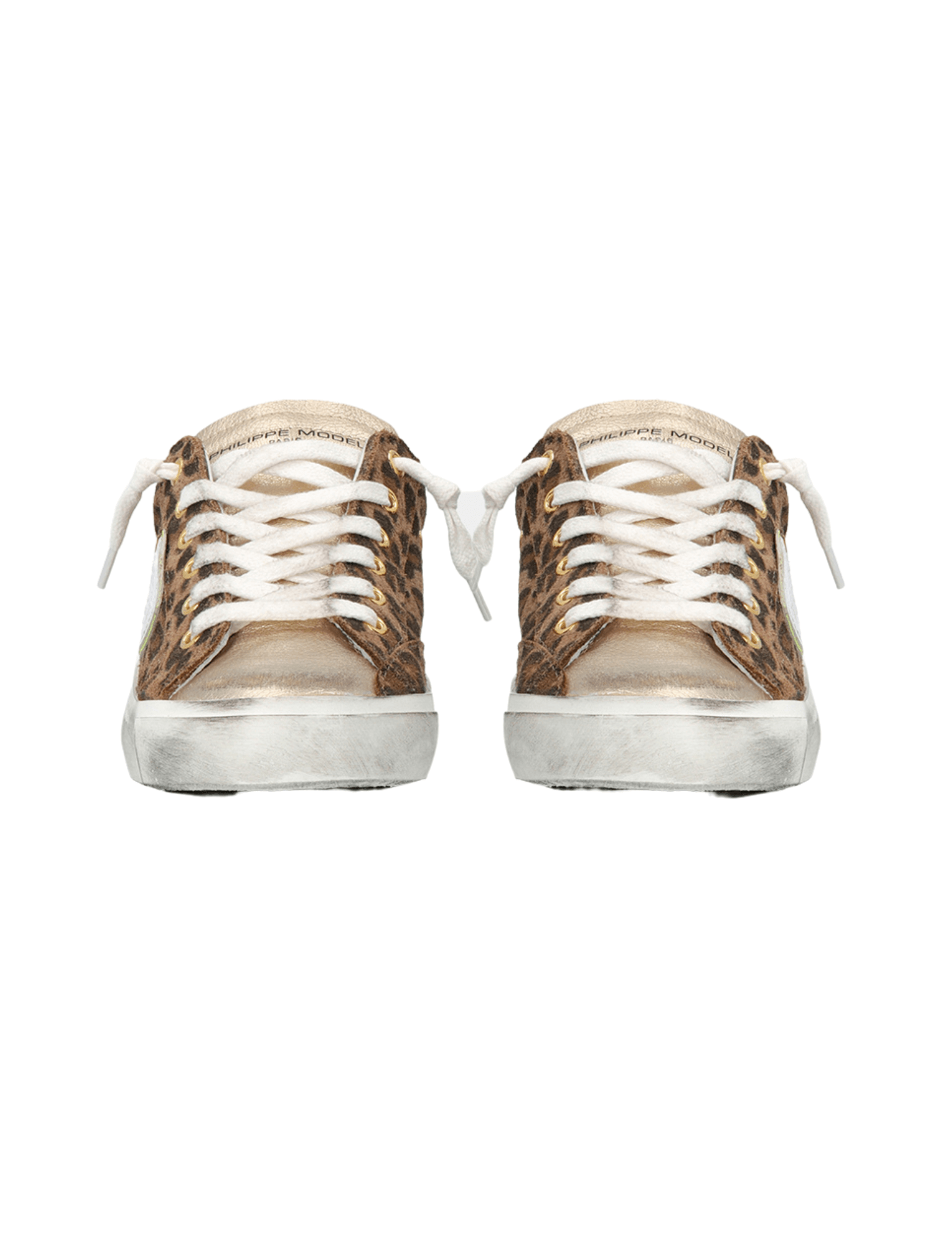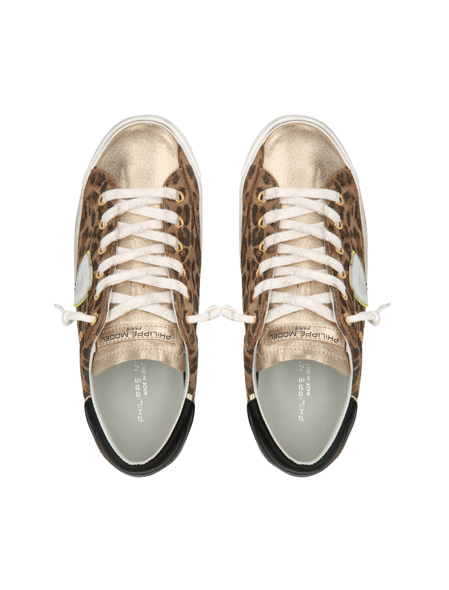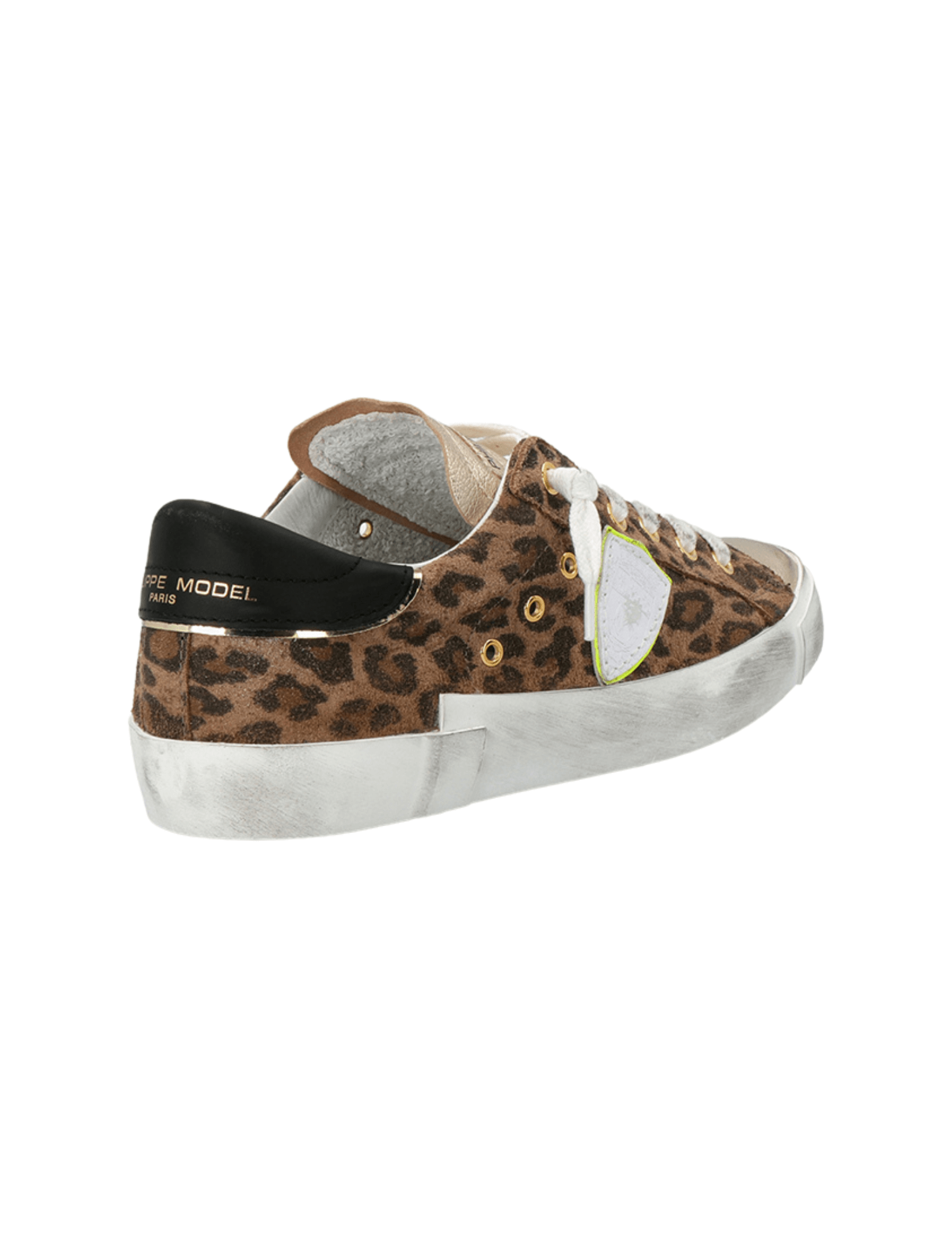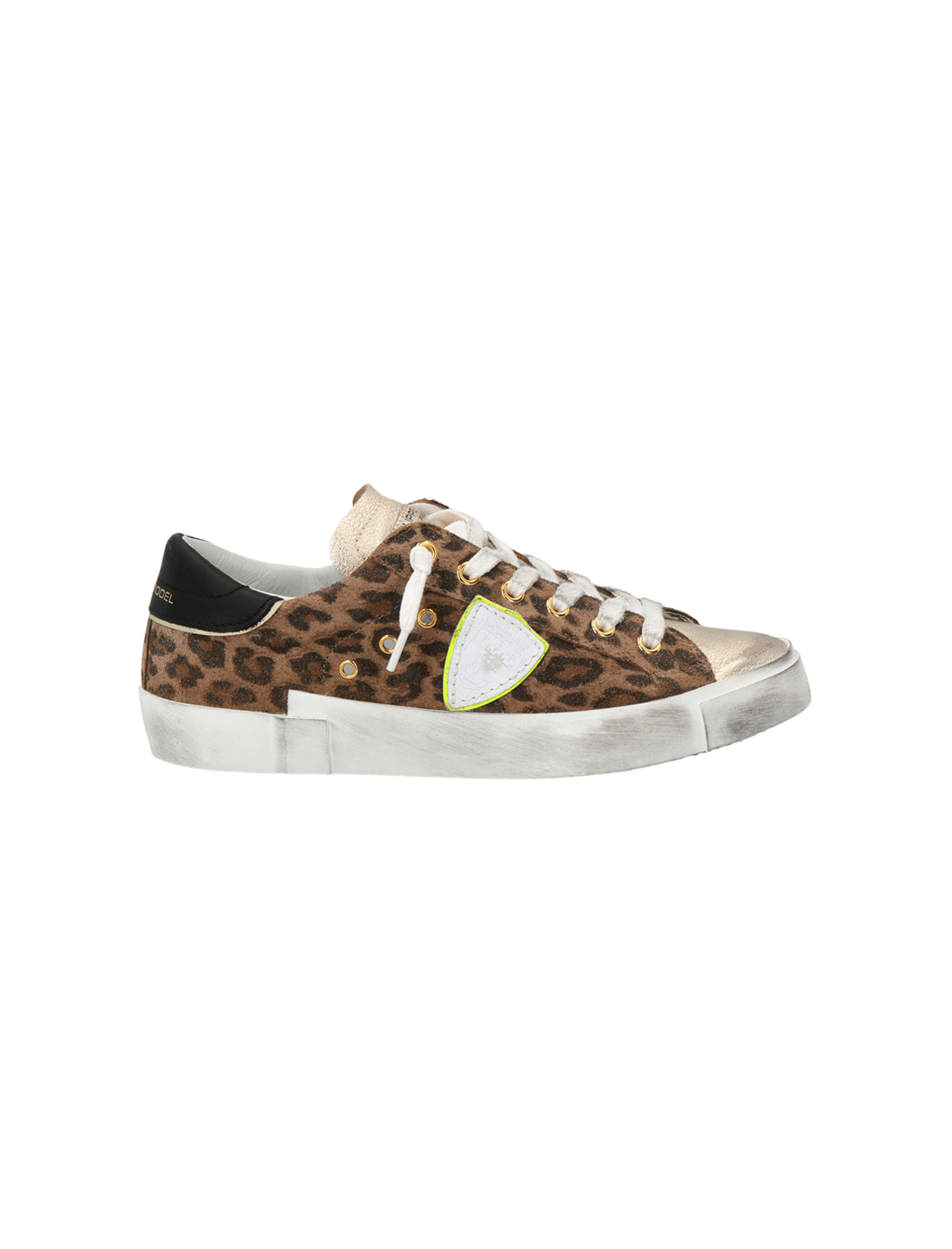Elevate your off duty style with the PRSX Low Sneaker in Animalier Leo Beige by Italian shoe master Philippe Model. Featuring a contemporary take on the iconic Paris model. These low top sneakers showcase the lived in look to it's best. Made from a soft suede leopard print, metallic gold leather tongue and golden eyelets. This cool chic number features a contrasting black leather heel tab with the a neon yellow Philippe Model signature shield detail.