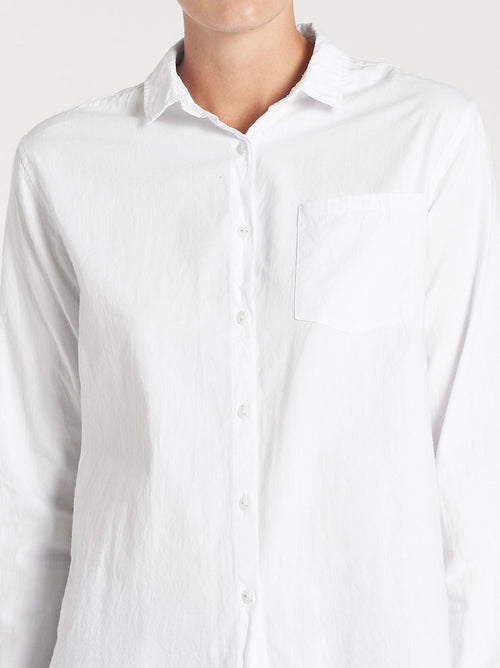 Its relaxed, slouchy silhouette is finished with a straight hem and side splits, making it perfect for a half-tuck or to be worn loose. The simple patch pocket on the chest adds a classic, effortless detail. This versatile shirt can be styled with anything from high-waisted denim for a polished look to thrown open over a dress for a casual, layered feel.
