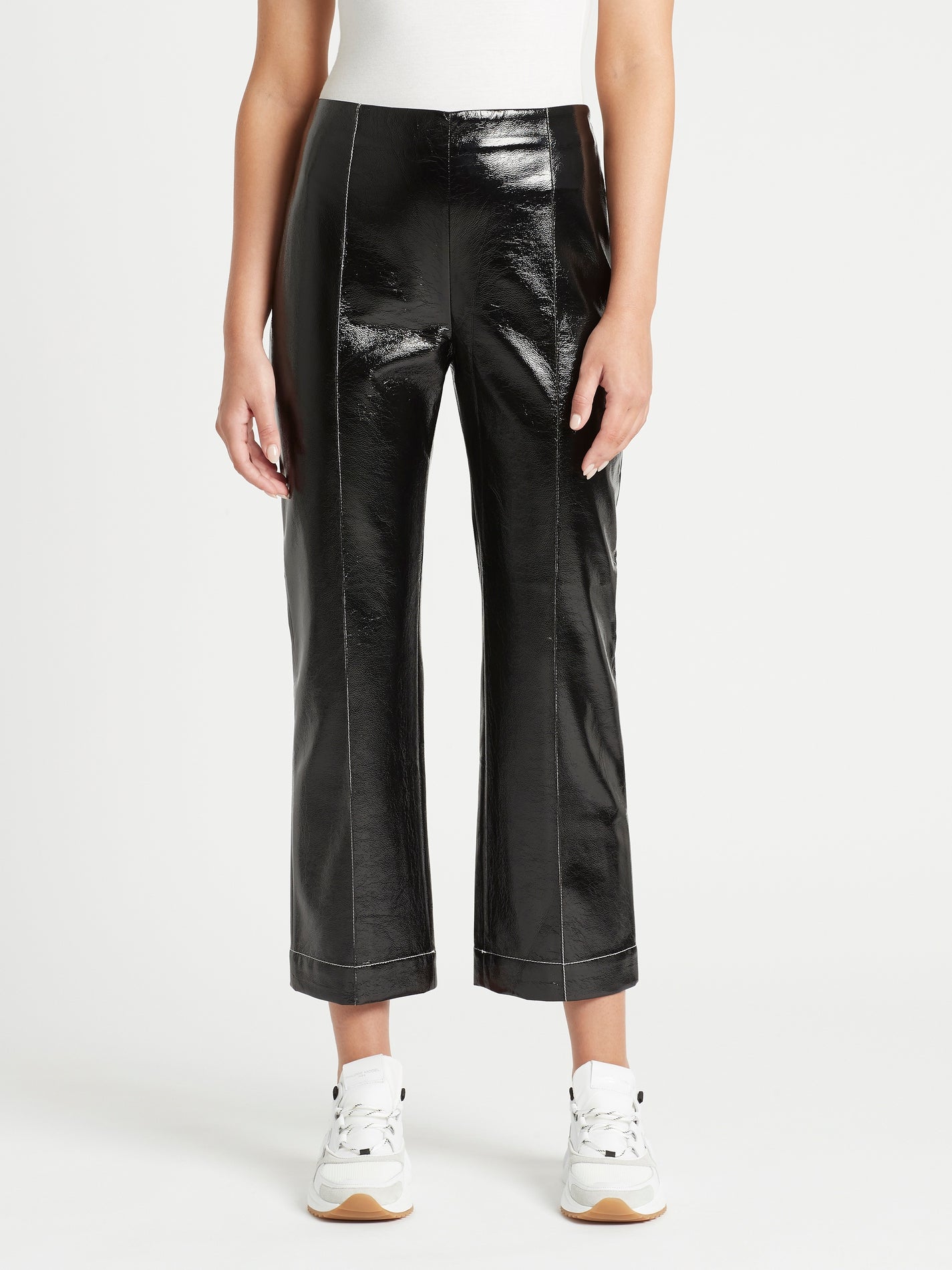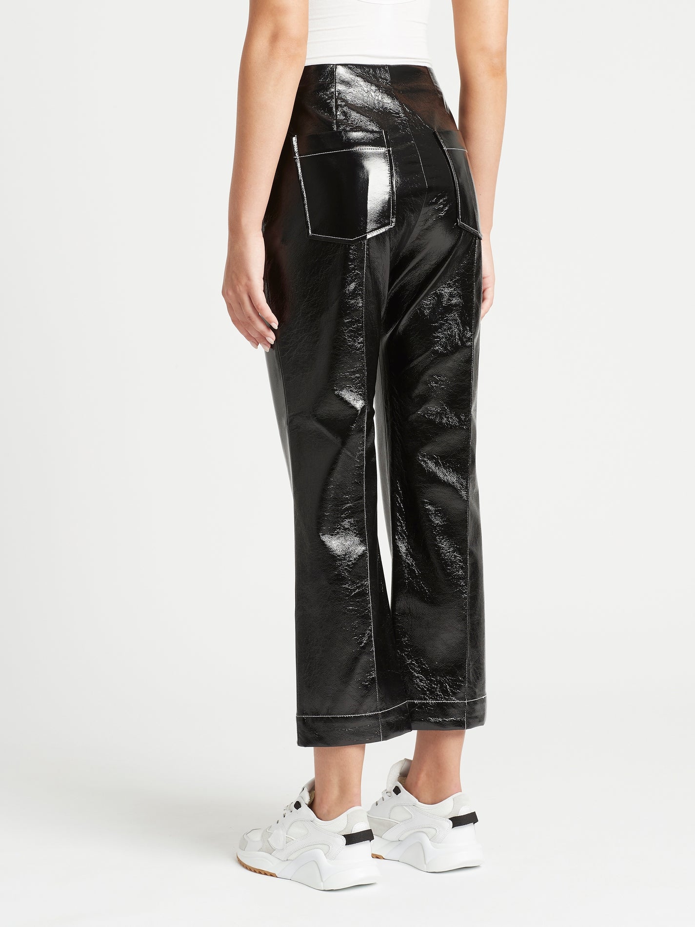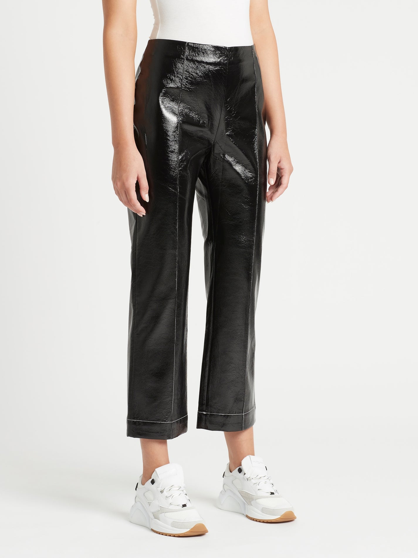 Style meets elegance with the Baum Und Pferdgarten Nardea Pant in Black. These patent cropped trousers feature a shiny lacquered finish, two patch pockets on the back, contrast stitching detail and are finished with a subtle flare at the hem. Team with the Baum Und Pferdgarten Bracca Jacket for the full look or simply style with a white crew neck tee and classic slides for no fuss style.