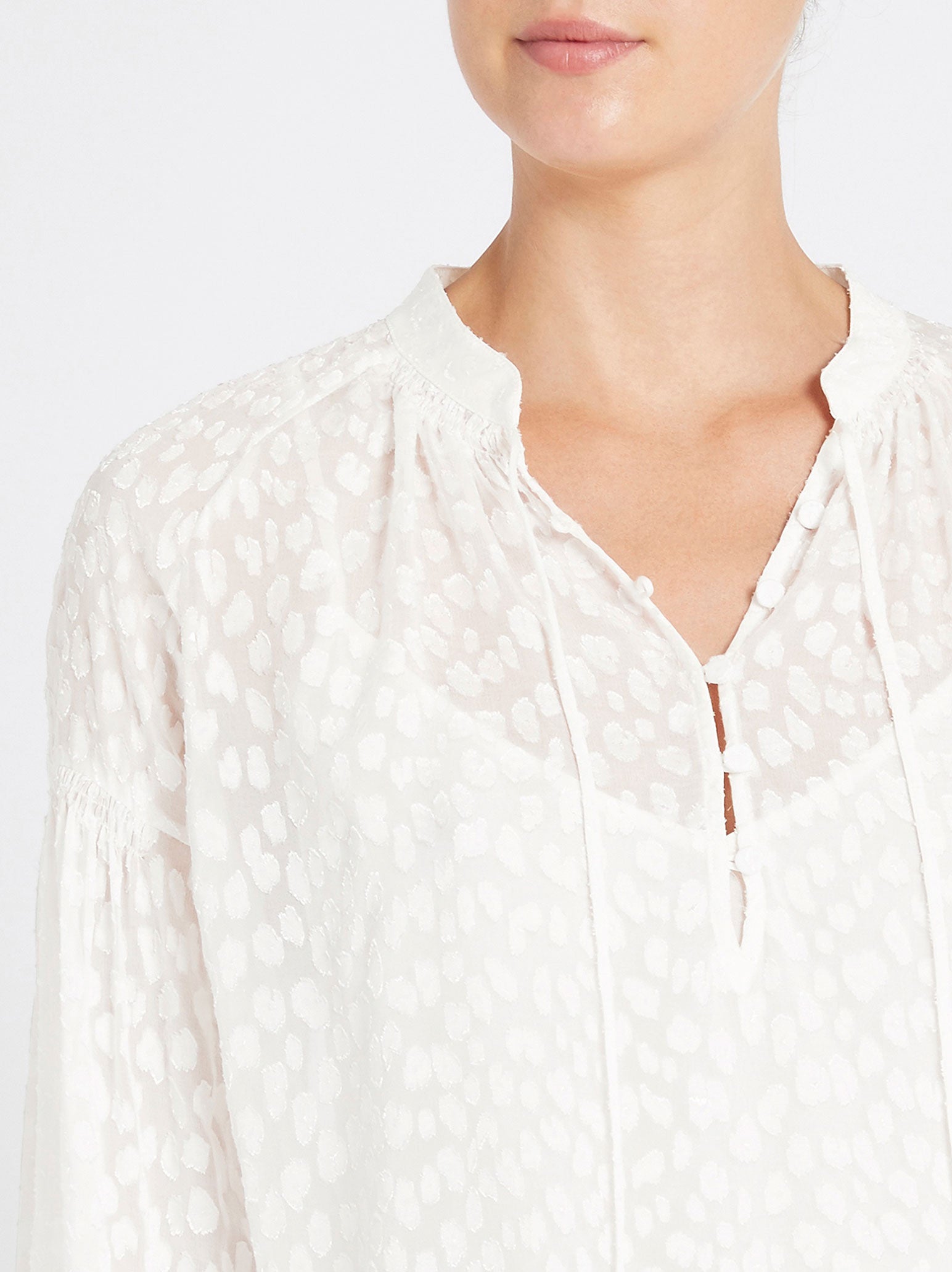 The Frame Denim Smocked Peasant Top in Off White is the perfect classic white blouse to add to your essentials wardrobe. Constructed from a silk blend this timeless piece features a high neckline with subtle gathered detailing, a centre front self tie and button closure, dropped sleeves, subtle gathering at the cuff and is given an edgy touch with its leopard burn out finish.