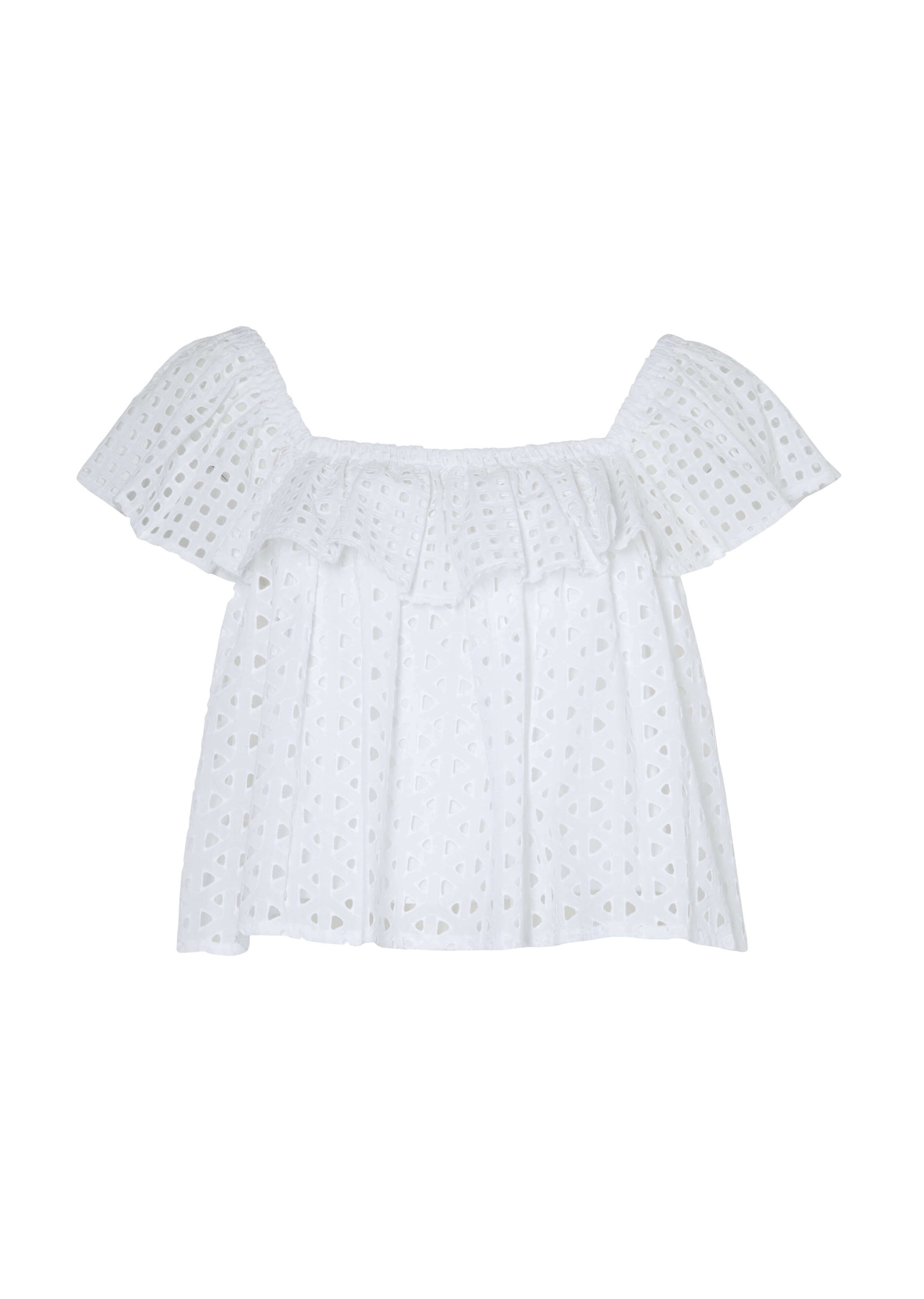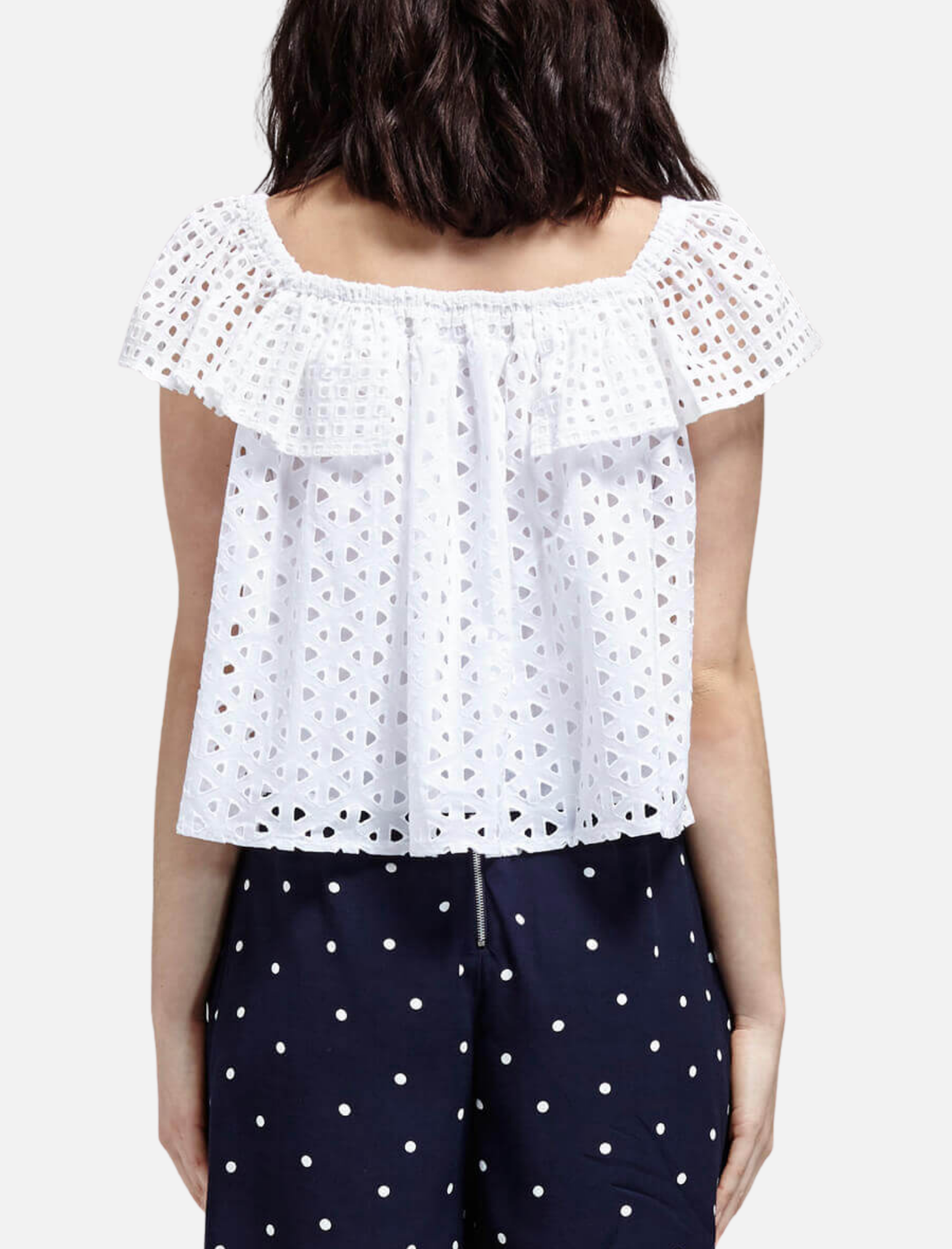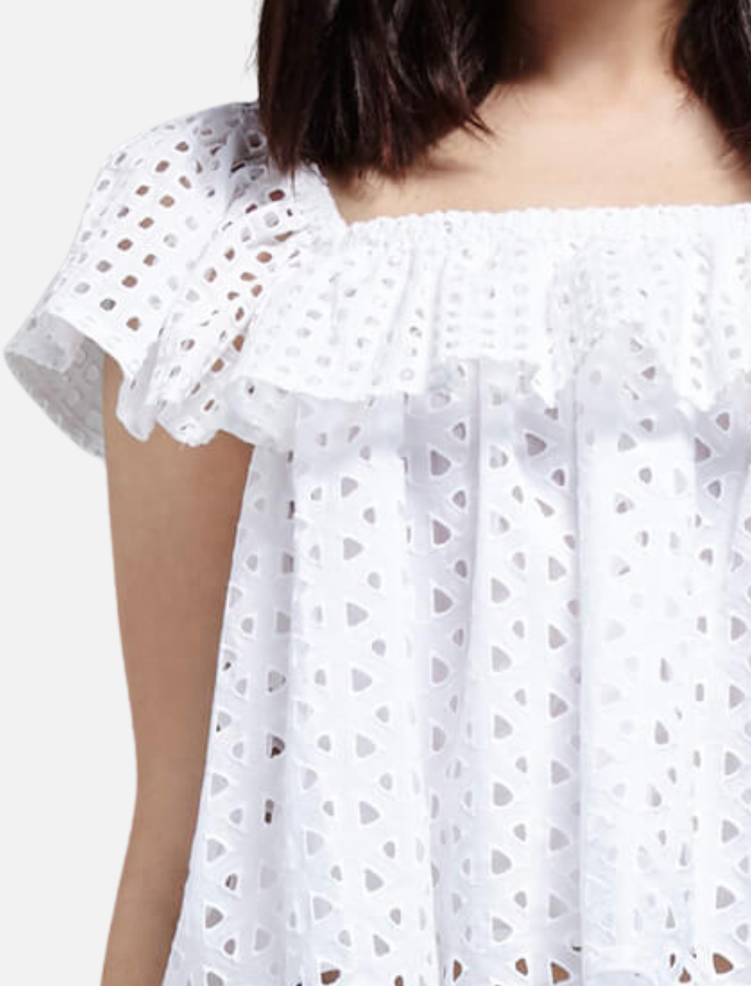 The Celestine Top from Rebecca Minkoff is a versatile Cotton Eyelet Top, featuring an elasticised neckline and tonal lining. Sweet yet sexy, the Celestine Top features a ruffled collar and a straight hem. A relaxed fit, wear this feminine top on or off the shoulder.