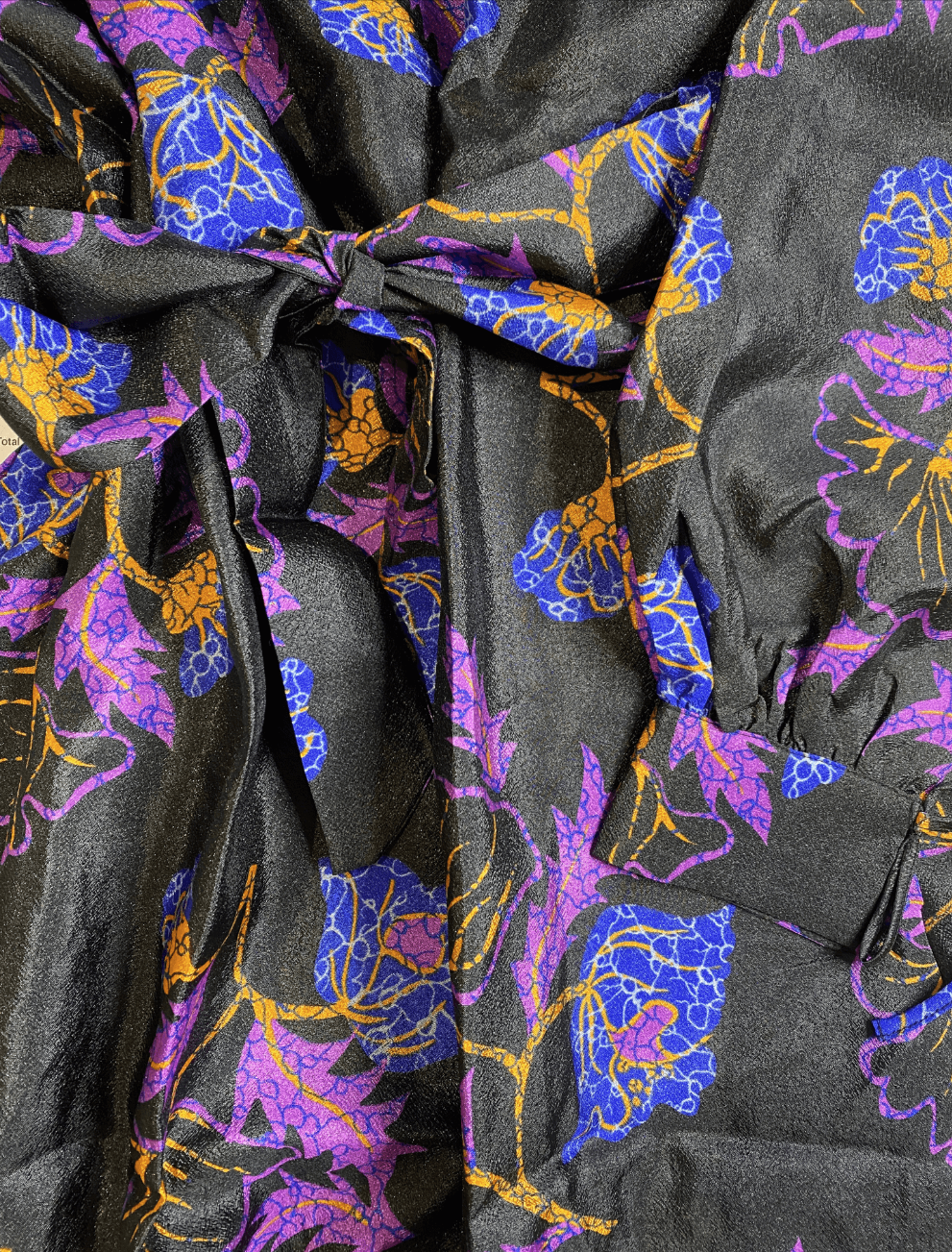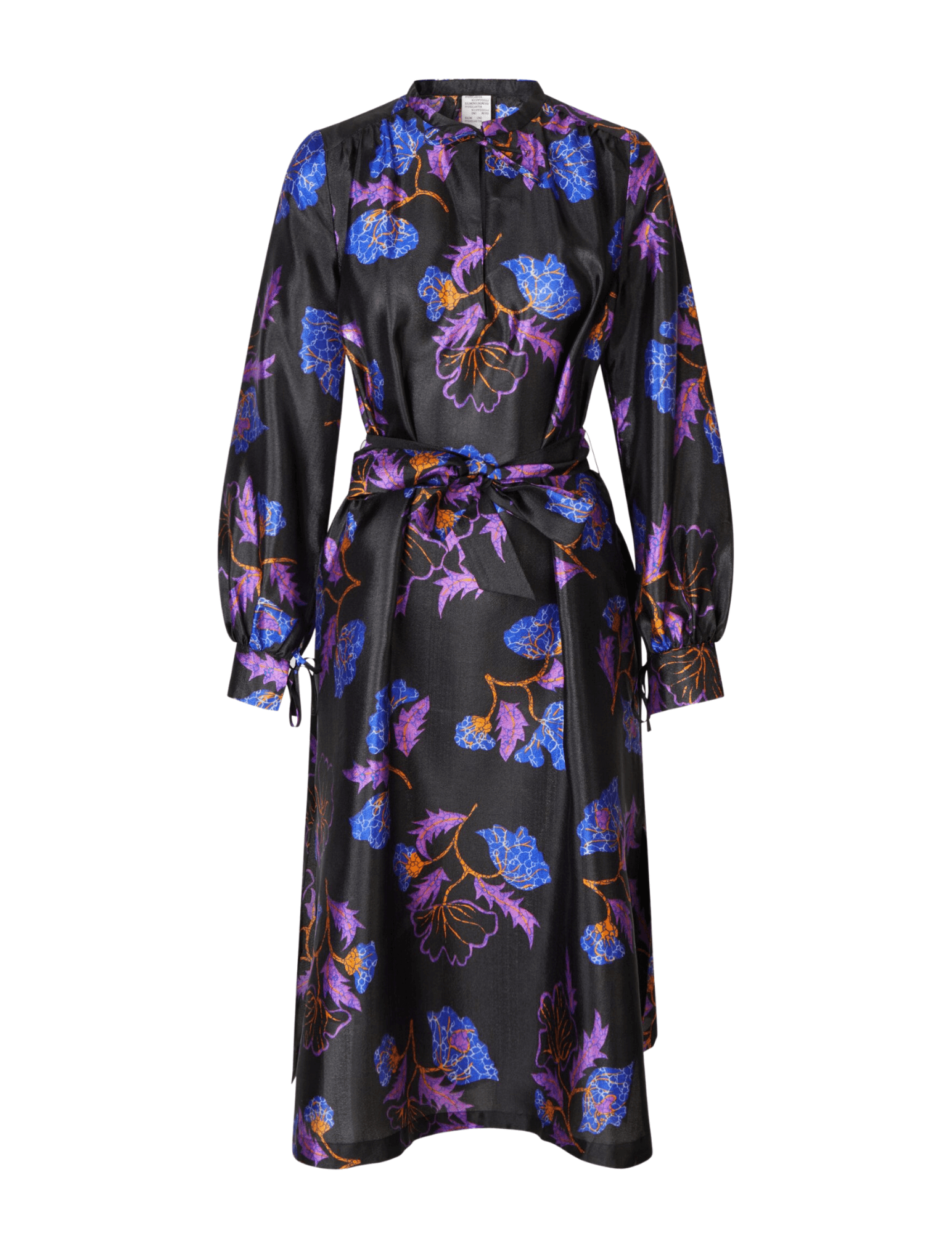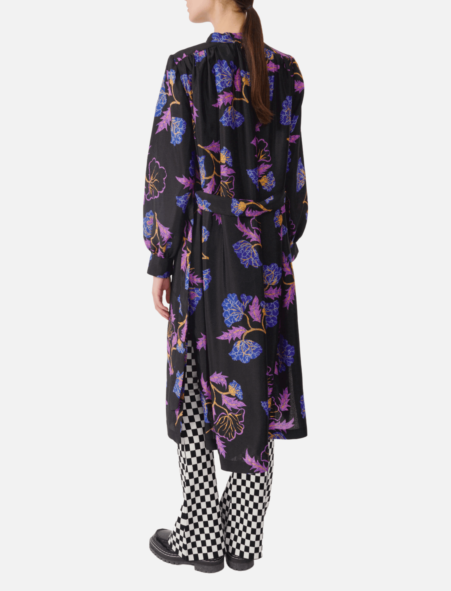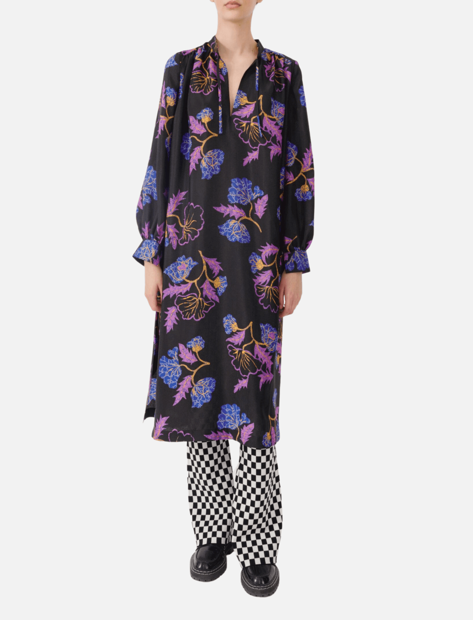 The florally infused Aradin Dress from Dutch style queens Baum Und Pferdgarten is perfect for transeasonal dressing. Made from a lightweight recycled polyester this loose fitting style can we worn flowy or ties features at the waist and wrists allow for a more structured look. With long billowing sleeves and gathered back neck yoke provides a feminine edge to this calf length dress . A side split detail completes the hem, can be worn with sandals or combat boots depending on your mood.