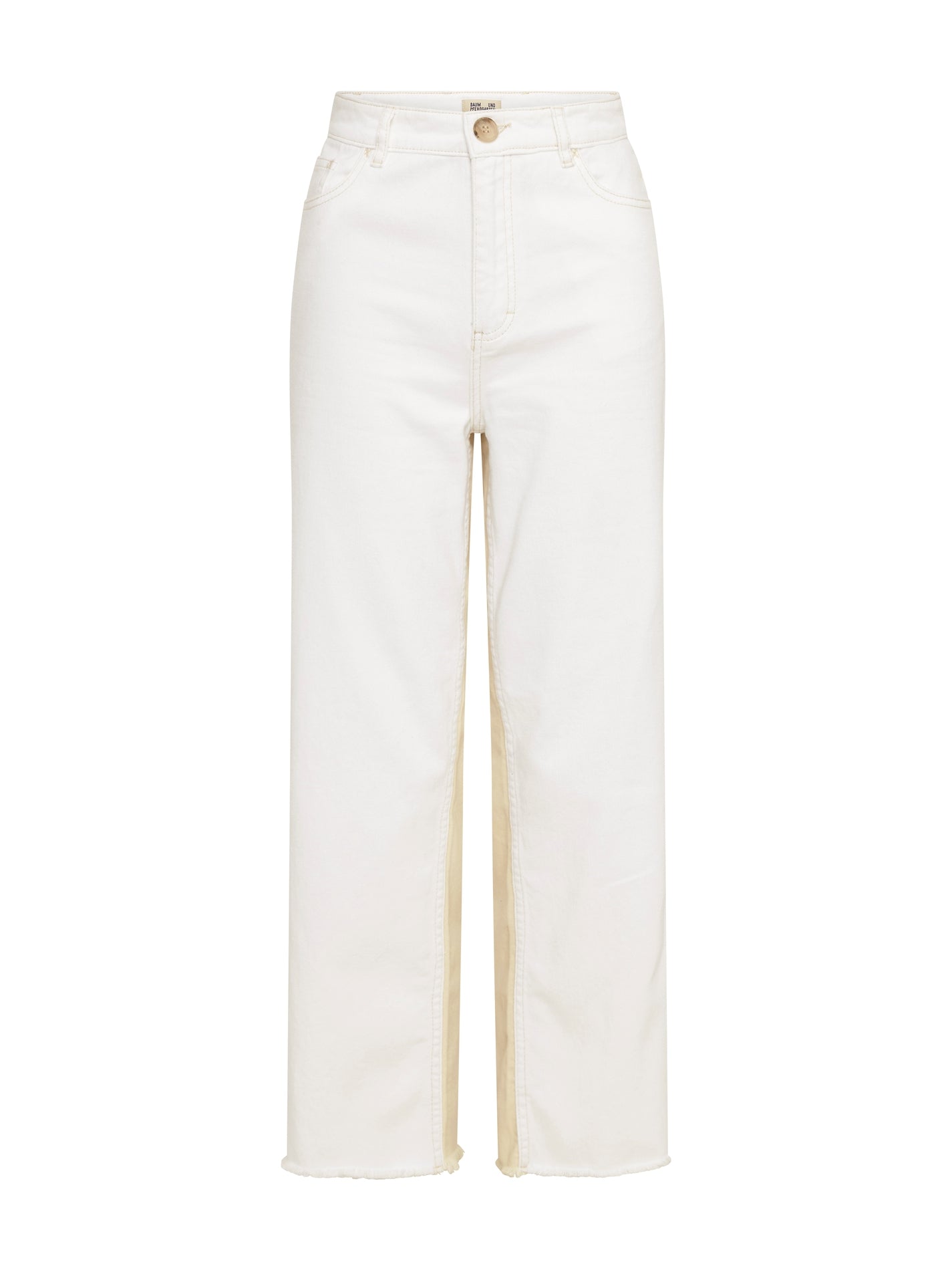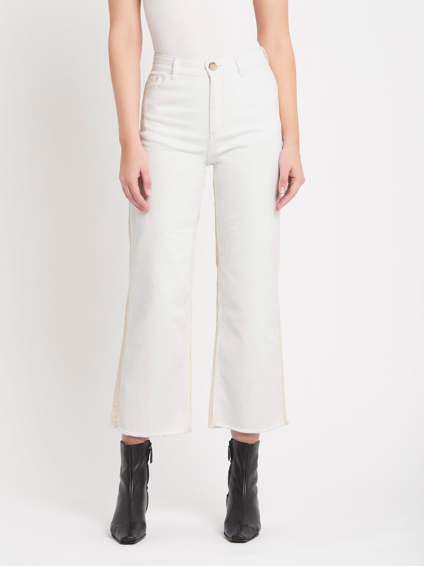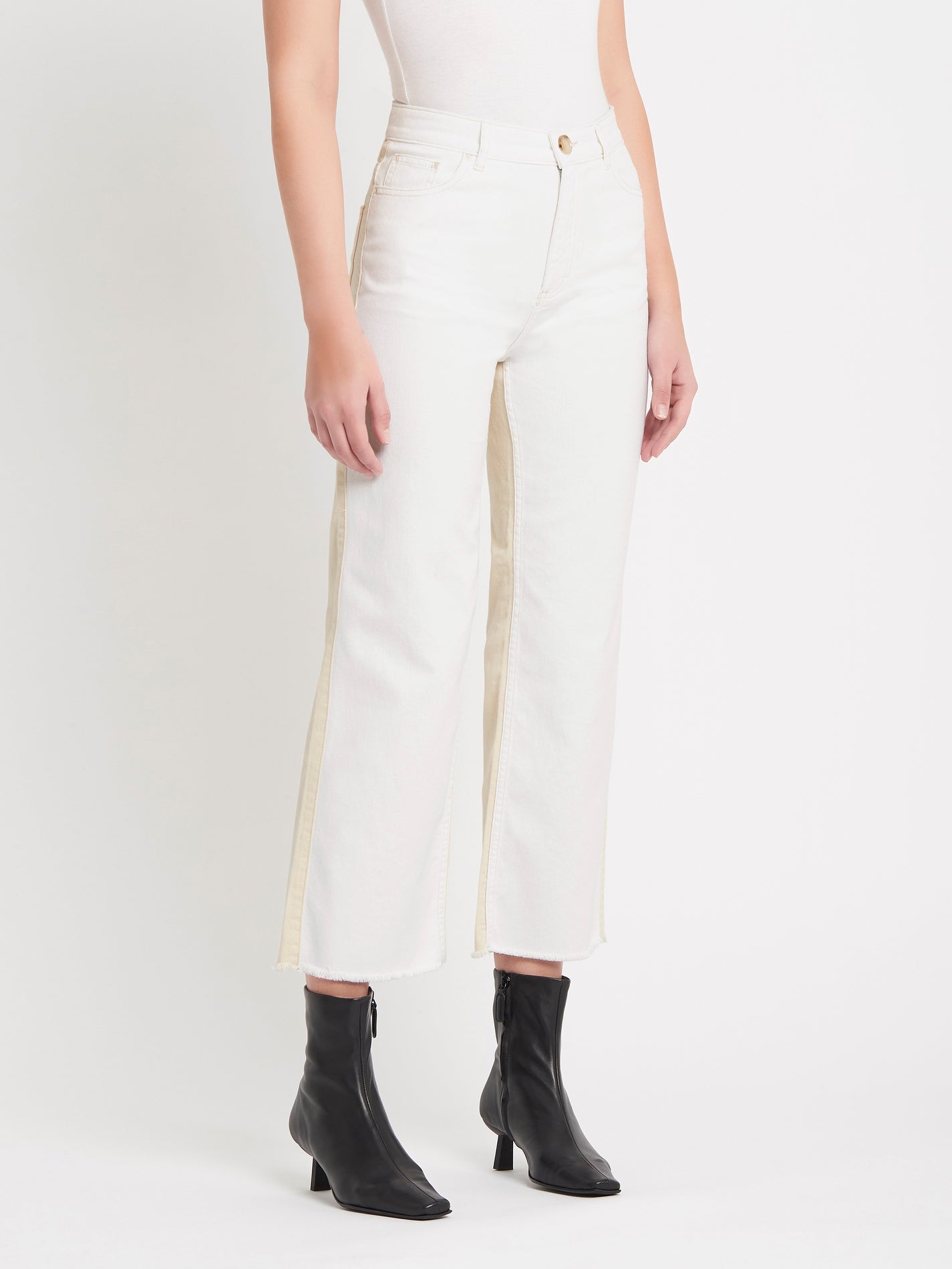 Split the difference in the Needra Jean in Denim Cream Patch from danish stalwarts Baum Und Pferdgarten. These high-waisted, cropped jeans feature a frayed hem detail on a wide legged slightly flared fit. The front fabric is a fresh white, while the back of the jeans are cream, featuring side and back pockets with a zip fly and shell button closure.