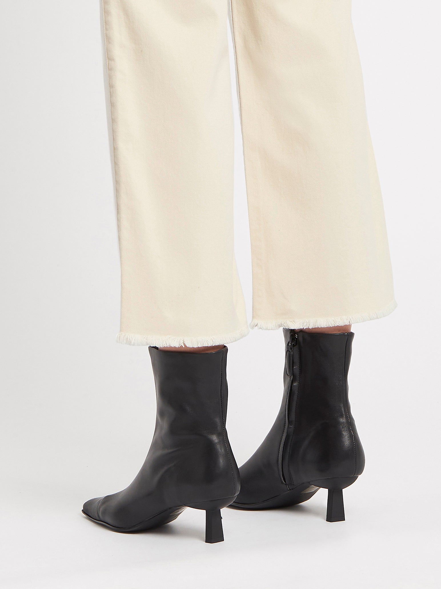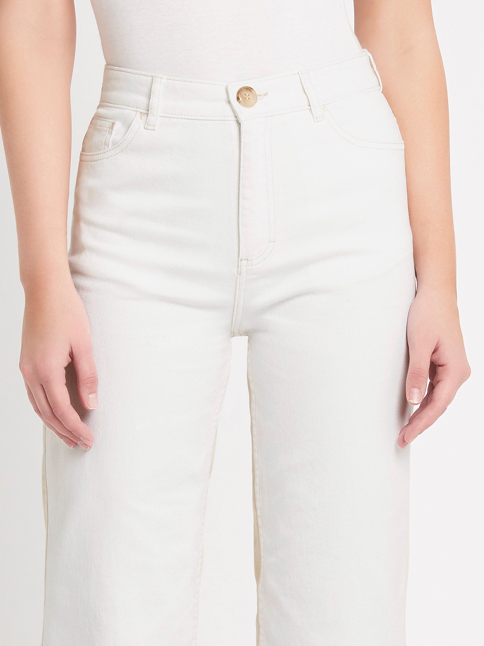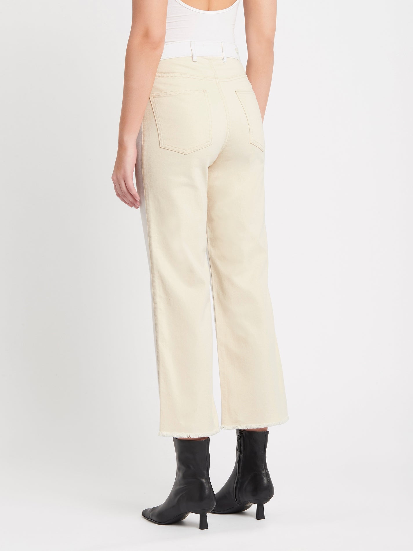 Split the difference in the Needra Jean in Denim Cream Patch from danish stalwarts Baum Und Pferdgarten. These high-waisted, cropped jeans feature a frayed hem detail on a wide legged slightly flared fit. The front fabric is a fresh white, while the back of the jeans are cream, featuring side and back pockets with a zip fly and shell button closure.