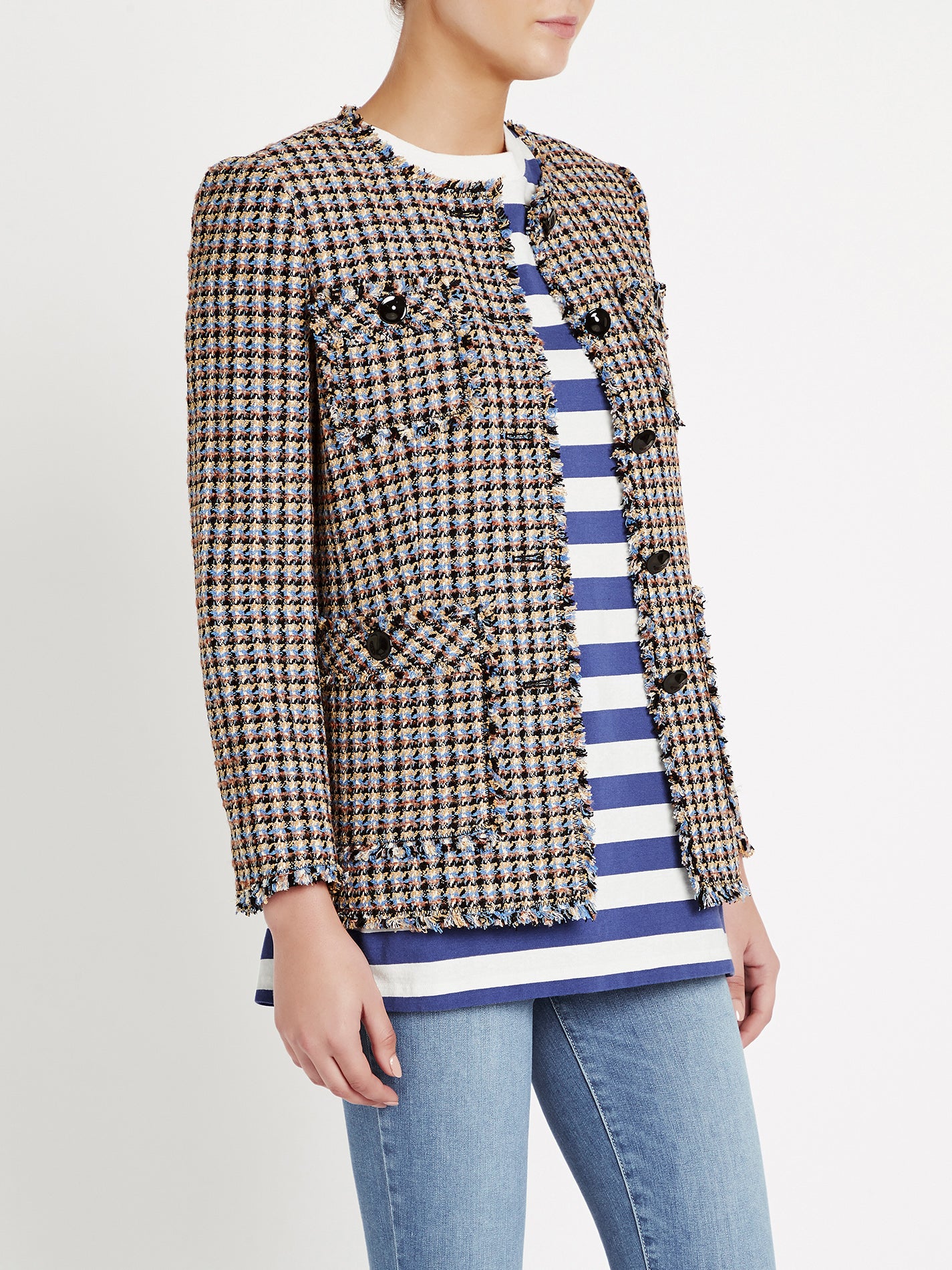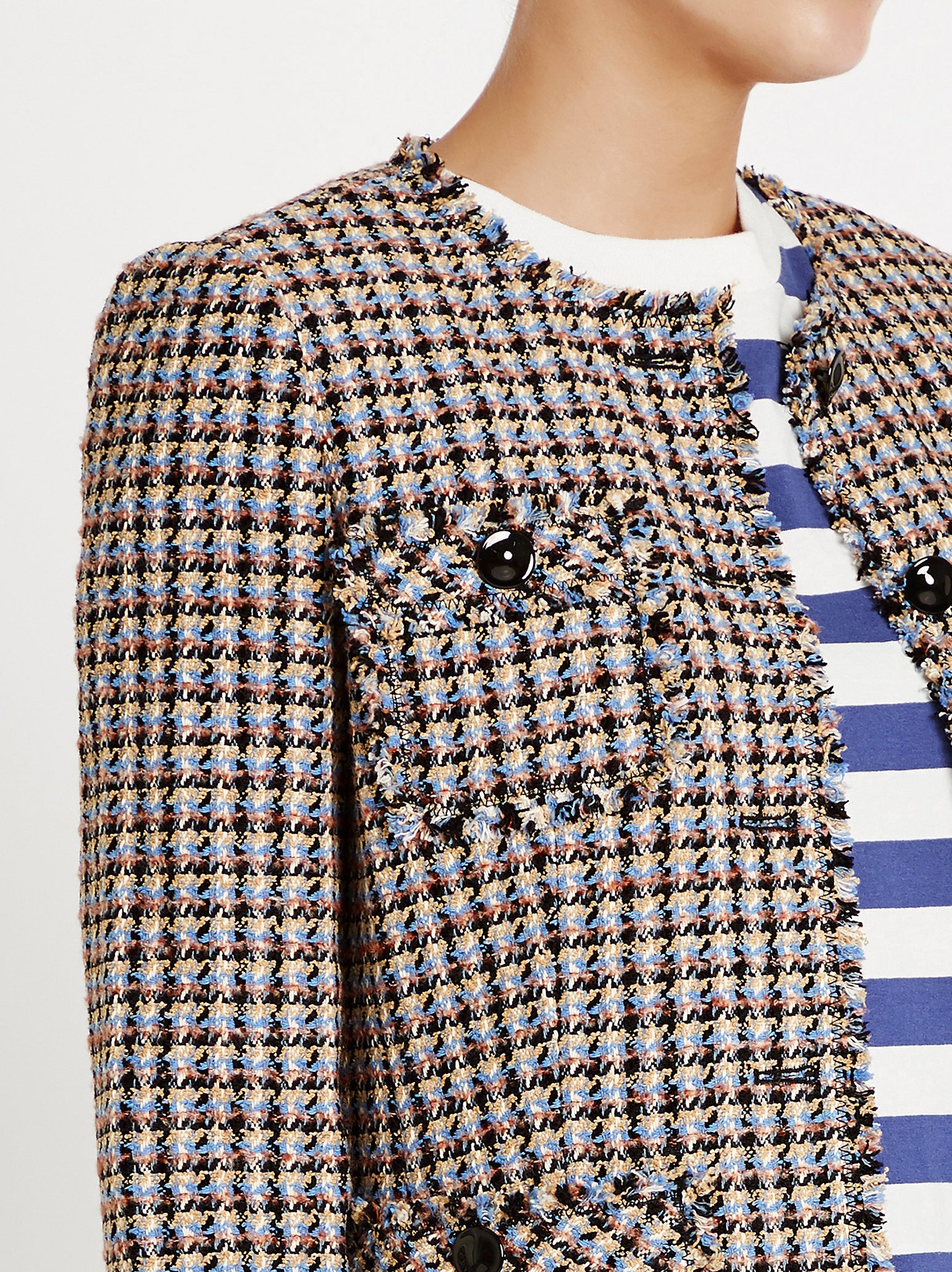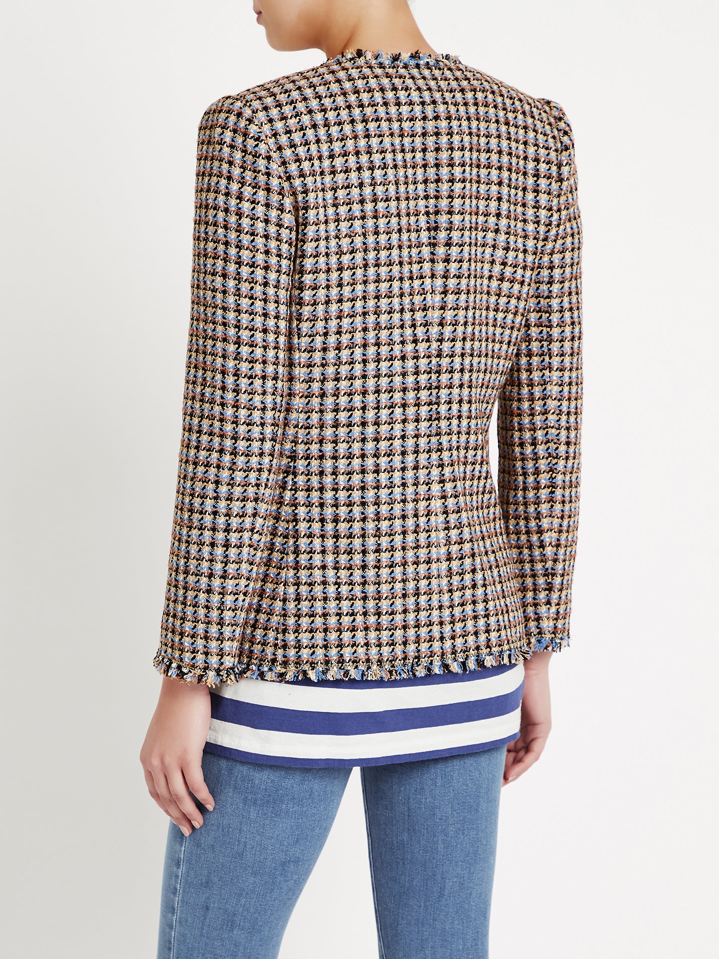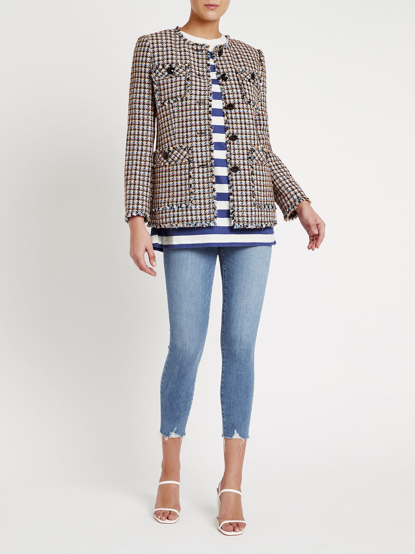 The Rebecca Taylor Houndstooth Tweed Jacket in Robins Egg Combo fits true to size