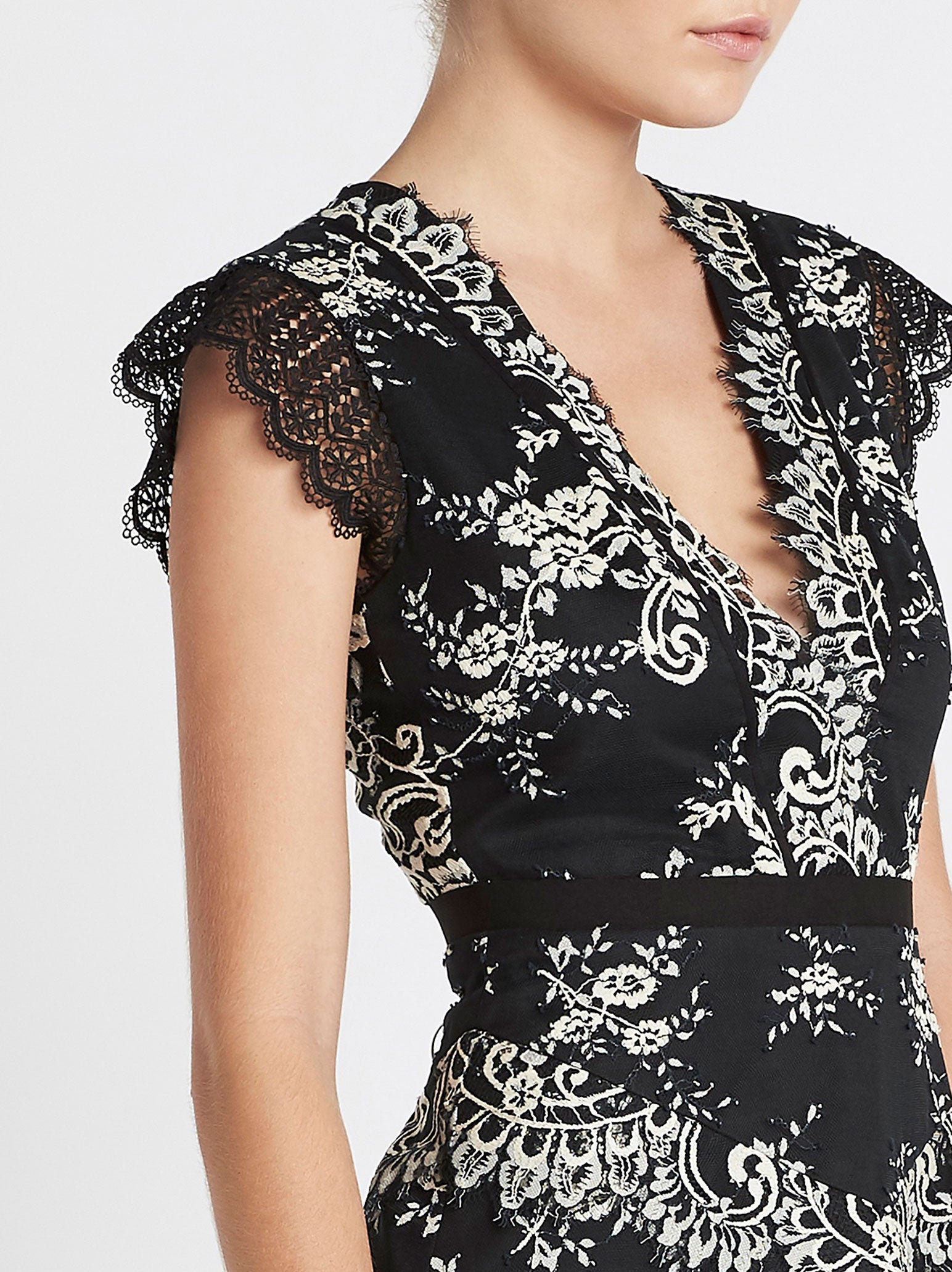 The Three Floor Lace Parade Dress in Black / Off White fits true to size.